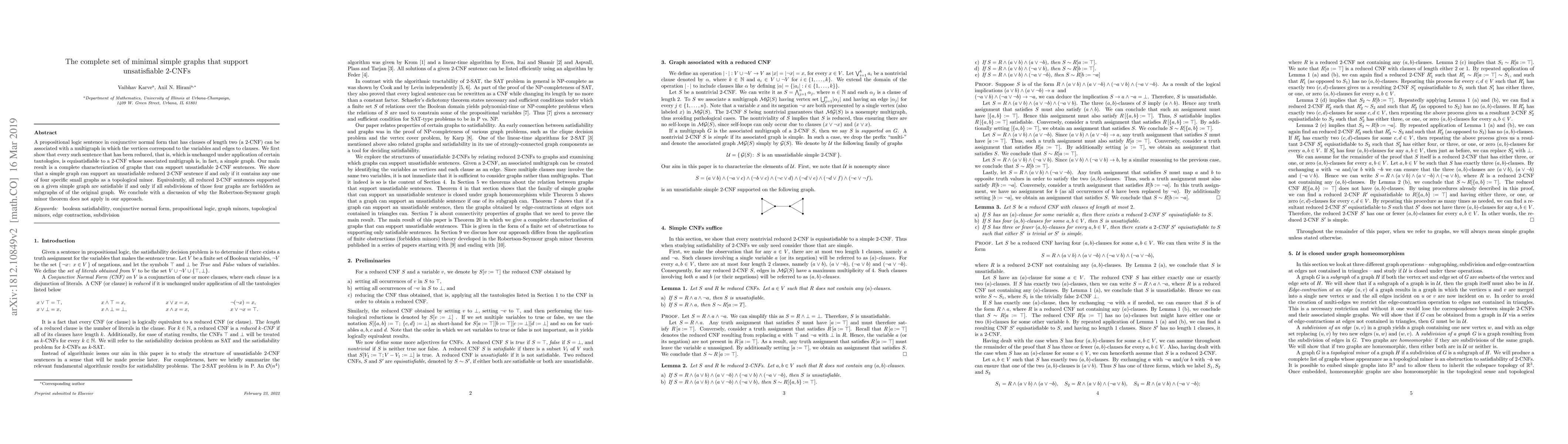 A new study characterizes simple graphs that can support unsatisfiable 2-CNF sentences, finding that only four specific small graphs serve as topological minors, and that these graphs' subdivisions determine the satisfiability of sentences on a given graph.