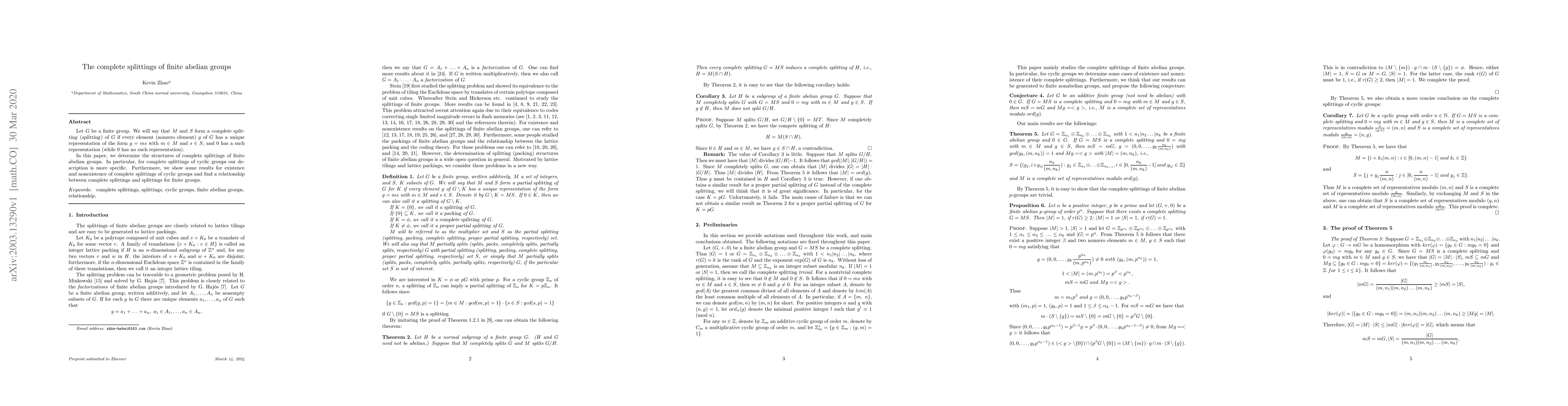 Let $G$ be a finite group. We will say that $M$ and $S$ form a \textsl{complete splitting} (\textsl{splitting}) of $G$ if every element (nonzero element) $g$ of $G$ has a unique representation of the form $g=ms$ with $m\in M$ and $s\in S$, and $0$ has a such representation (while $0$ has no such representation). In this paper, we determine the structures of complete splittings of finite abelian groups. In particular, for complete splittings of cyclic groups our description is more specific. Furthermore, we show some results for existence and nonexistence of complete splittings of cyclic groups and find a relationship between complete splittings and splittings for finite groups.