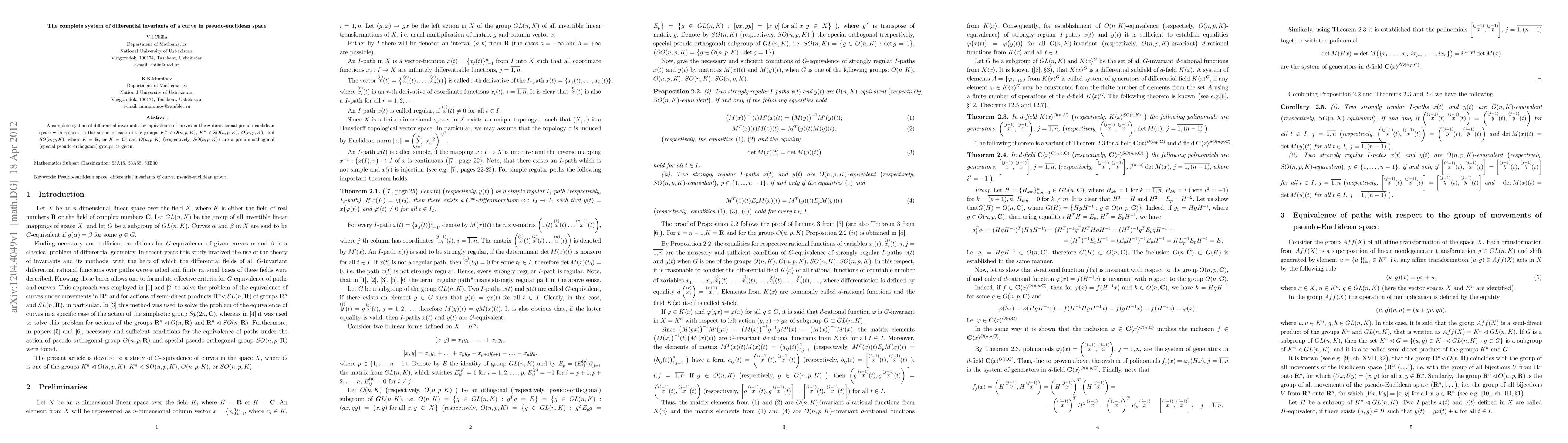 A complete system of differential invariants for equivalence of curves in the $n$-dimensional pseudo-euclidean space with respect to the action of each of the groups $K^n \lhd O(n,p,K)$, $K^n \lhd SO(n,p,K)$, $O(n,p,K)$, and $SO(n,p,K)$, where $K = \mathbf{R}$, or $K = \mathbf{C}$, and $O(n,p,K)$ $\bigl($respectively, $SO(n,p,K)\big)$ are a pseudo-orthogonal (special pseudo-orthogonal) groups, is given.