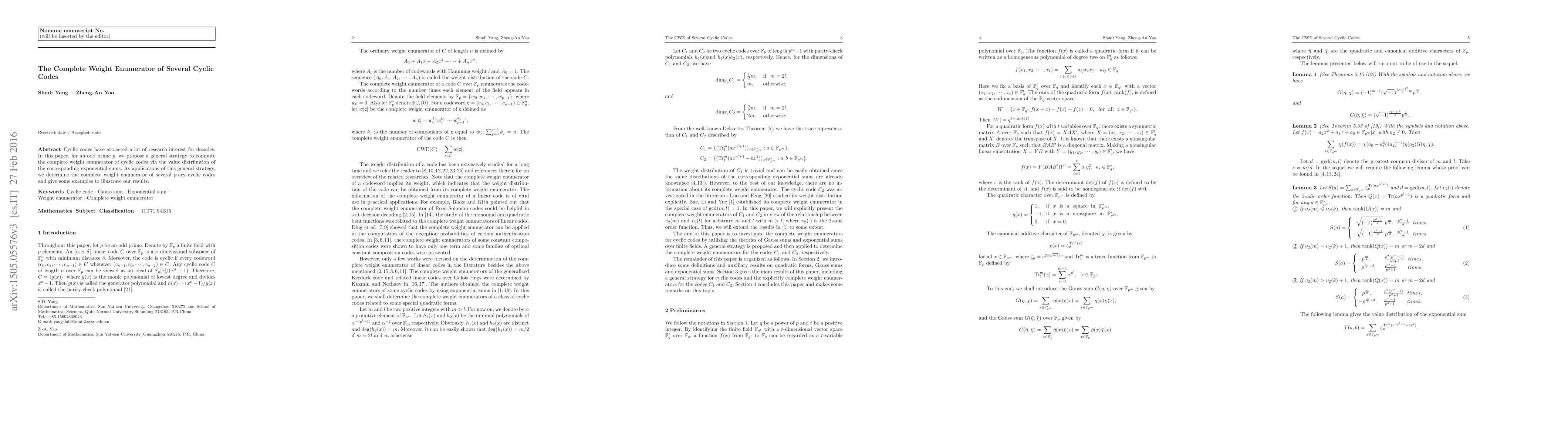 This paper presents a new method for computing the complete weight enumerator of cyclic codes using exponential sums, applying this technique to several $p$-ary cyclic codes and demonstrating its effectiveness with examples.