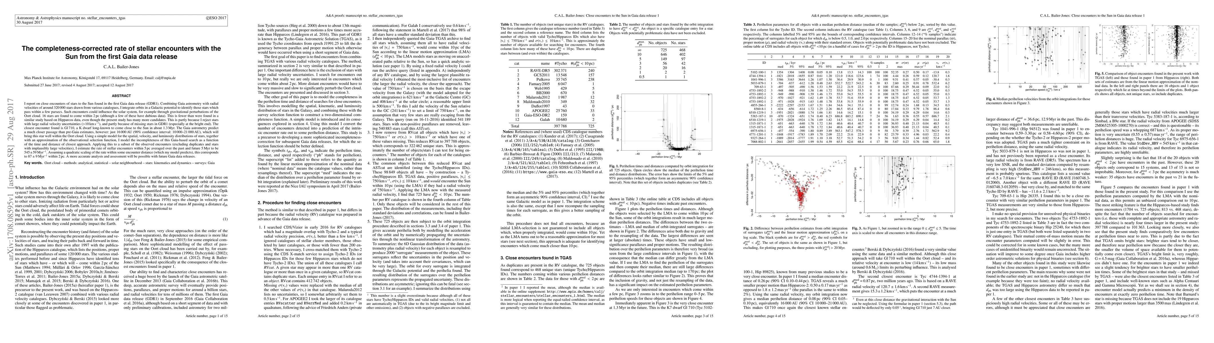I report on close encounters of stars to the Sun found in the first Gaia data release (GDR1). Combining Gaia astrometry with radial velocities of around 320 000 stars drawn from various catalogues, I integrate orbits in a Galactic potential to identify those stars which pass within a few parsecs. Such encounters could influence the solar system, for example through gravitational perturbations of the Oort cloud. 16 stars are found to come within 2 pc (although a few of these have dubious data). This is fewer than were found in a similar study based on Hipparcos data, even though the present study has many more candidates. This is partly because I reject stars with large radial velocity uncertainties (>10 km/s), and partly because of missing stars in GDR1 (especially at the bright end). The closest encounter found is Gl 710, a K dwarf long-known to come close to the Sun in about 1.3 Myr. The Gaia astrometry predict a much closer passage than pre-Gaia estimates, however: just 16 000 AU (90% confidence interval: 10 000 to 21 000 AU), which will bring this star well within the Oort cloud. Using a simple model for the spatial, velocity, and luminosity distributions of stars, together with an approximation of the observational selection function, I model the incompleteness of this Gaia-based search as a function of the time and distance of closest approach. Applying this to a subset of the observed encounters (excluding duplicates and stars with implausibly large velocities), I estimate the rate of stellar encounters within 5 pc averaged over the past and future 5 Myr to be 545 +/- 59 per Myr. Assuming a quadratic scaling of the rate within some encounter distance (which my model predicts), this corresponds to 87 +/- 9 per My within 2 pc. A more accurate analysis and assessment will be possible with future Gaia data releases.