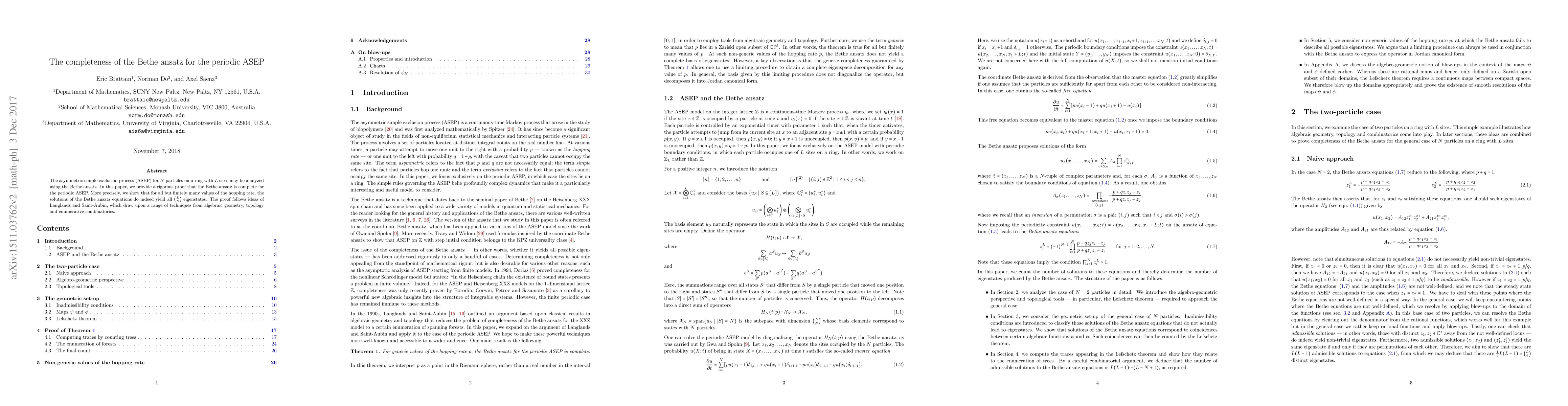 This paper rigorously proves the completeness of the Bethe ansatz for the periodic ASEP, demonstrating that it yields all possible eigenstates for all but finitely many hopping rates. The proof employs techniques from algebraic geometry, topology, and enumerative combinatorics inspired by Langlands and Saint-Aubin.