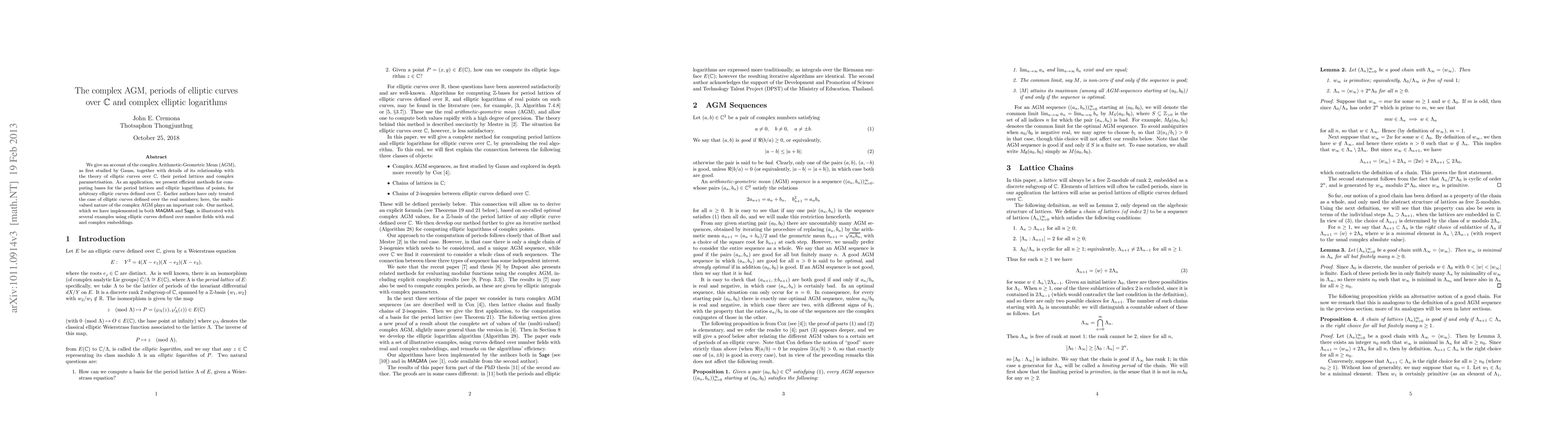 This paper explores the complex Arithmetic-Geometric Mean (AGM) and its connection to the theory of elliptic curves over $\C$, focusing on period lattices and complex parametrisation. It introduces efficient methods for computing period lattice bases and elliptic logarithms for elliptic curves defined over $\C$, extending beyond real-number cases.
