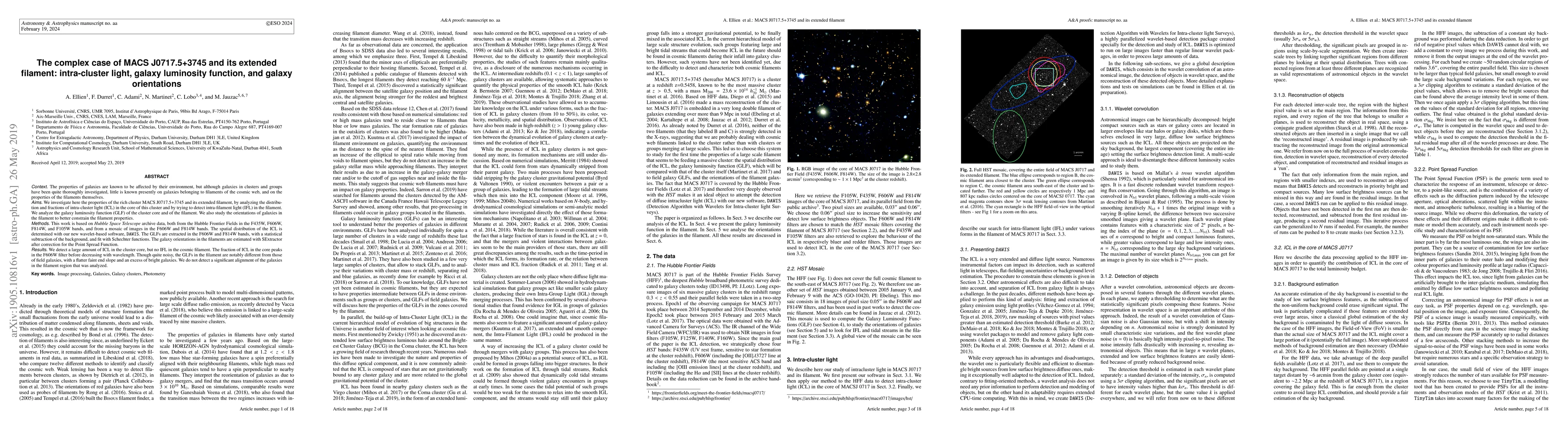 The properties of galaxies are known to be affected by their environment, but although galaxies in clusters and groups have been quite thoroughly investigated, little is known presently on galaxies belonging to filaments of the cosmic web, and on the properties of the filaments themselves. We investigate here the properties of the rich cluster MACSJ0717.5+3745 and its extended filament, by analyzing the distribution and fractions of intra-cluster light (ICL) in the core of this cluster and by trying to detect intra-filament light (IFL) in the filament. We analyze the galaxy luminosity function (GLF) of the cluster core and of the filament. We also study the orientations of galaxies in the filament to better constrain the filament properties. This work is based on Hubble Space Telescope archive data, both from the Hubble Frontier Fields in the F435W, F606W, F814W, and F105W bands, and from a mosaic of images in the F606W and F814W bands. The spatial distribution of the ICL is determined with our new wavelet-based software, DAWIS. The GLFs are extracted in the F606W and F814W bands, with a statistical subtraction of the background, and fit with Schechter functions. The galaxy orientations in the filaments are estimated with SExtractor after correction for the Point Spread Function. We detect a large amount of ICL in the cluster core, but no IFL in the cosmic filament. The fraction of ICL in the core peaks in the F606W filter before decreasing with wavelength. Though quite noisy, the GLFs in the filament are notably different from those of field galaxies, with a flatter faint end slope and an excess of bright galaxies. We do not detect a significant alignment of the galaxies in the filament region that was analyzed.