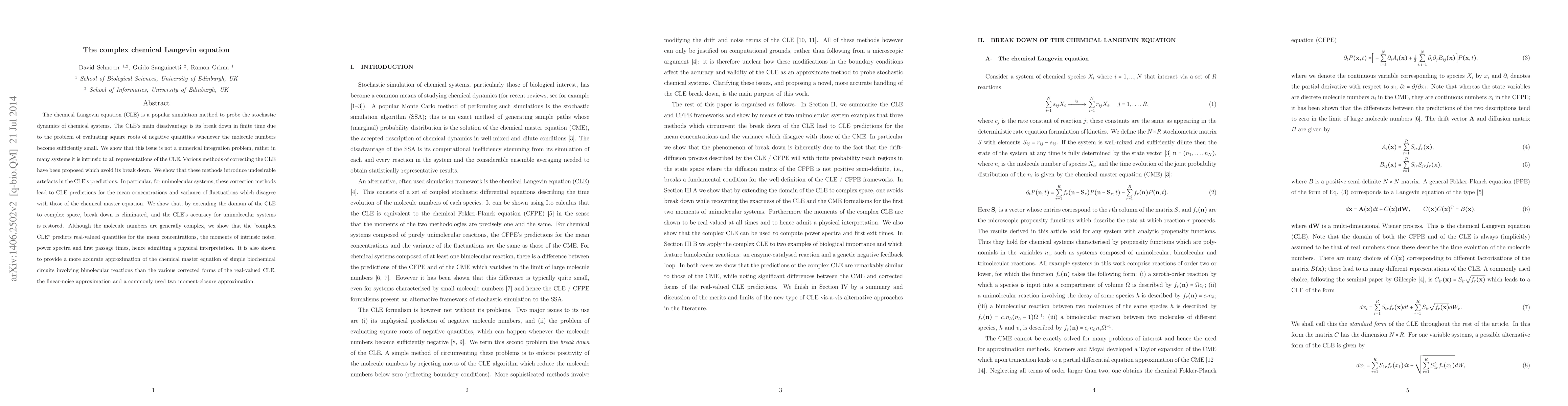 The paper discusses the breakdown of the chemical Langevin equation (CLE) due to negative square roots when molecule numbers are small, showing that this issue is intrinsic rather than numerical. It proposes extending the CLE to complex space to eliminate breakdown and restore accuracy, demonstrating that the "complex CLE" provides accurate predictions for real-valued quantities and outperforms other approximations for simple biochemical circuits.