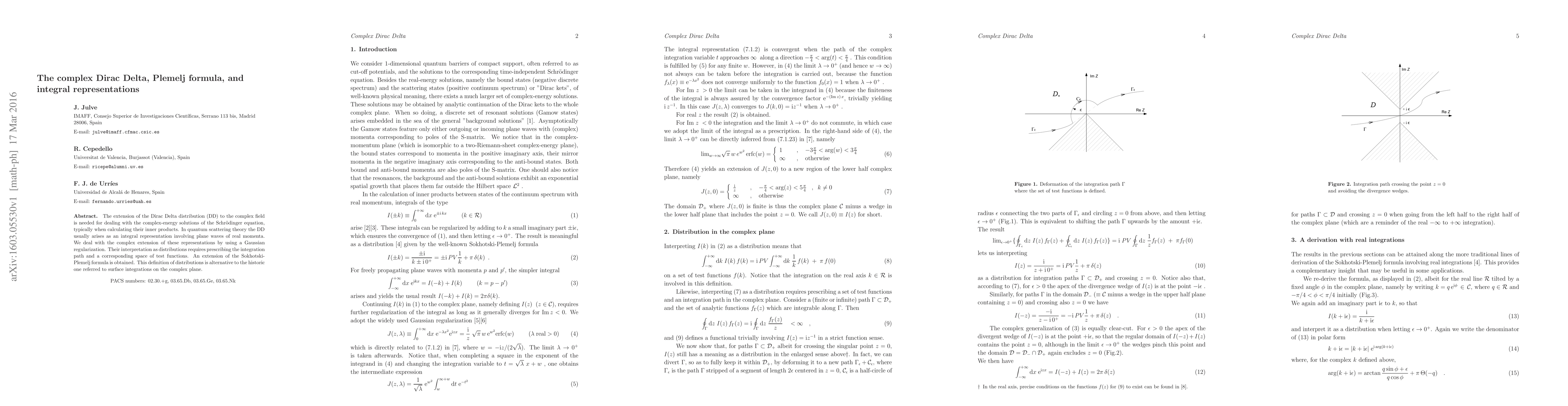 This paper extends the Dirac Delta distribution to the complex field to handle complex-energy solutions in quantum mechanics, employing Gaussian regularization and integral representations involving plane waves. It introduces an extended Sokhotski-Plemelj formula, offering an alternative definition of distributions compared to traditional surface integrations.