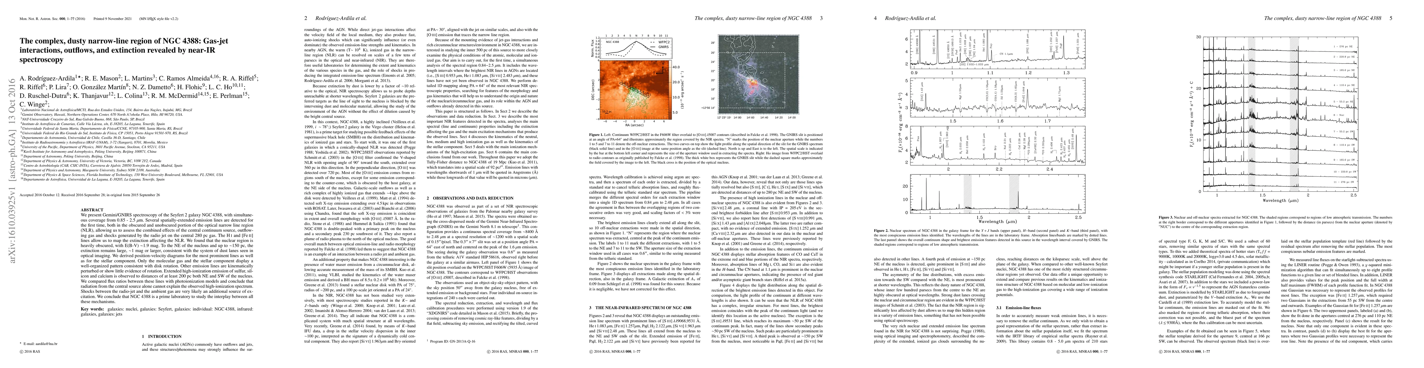 We present Gemini/GNIRS spectroscopy of the Seyfert 2 galaxy NGC 4388, with simultaneous coverage from 0.85 - 2.5 $\mu$m. Several spatially-extended emission lines are detected for the first time, both in the obscured and unobscured portion of the optical narrow line region (NLR), allowing us to assess the combined effects of the central continuum source, outflowing gas and shocks generated by the radio jet on the central 280 pc gas. The HI and [FeII] lines allow us to map the extinction affecting the NLR. We found that the nuclear region is heavily obscured, with E(B-V) ~1.9 mag. To the NE of the nucleus and up to ~150 pc, the extinction remains large, ~1 mag or larger, consistent with the system of dust lanes seen in optical imaging. We derived position-velocity diagrams for the most prominent lines as well as for the stellar component. Only the molecular gas and the stellar component display a well-organized pattern consistent with disk rotation. Other emission lines are kinematically perturbed or show little evidence of rotation. Extended high-ionization emission of sulfur, silicon and calcium is observed to distances of at least 200 pc both NE and SW of the nucleus. We compared flux ratios between these lines with photoionization models and conclude that radiation from the central source alone cannot explain the observed high-ionization spectrum. Shocks between the radio-jet and the ambient gas are very likely an additional source of excitation. We conclude that NGC 4388 is a prime laboratory to study the interplay between all these mechanisms.
