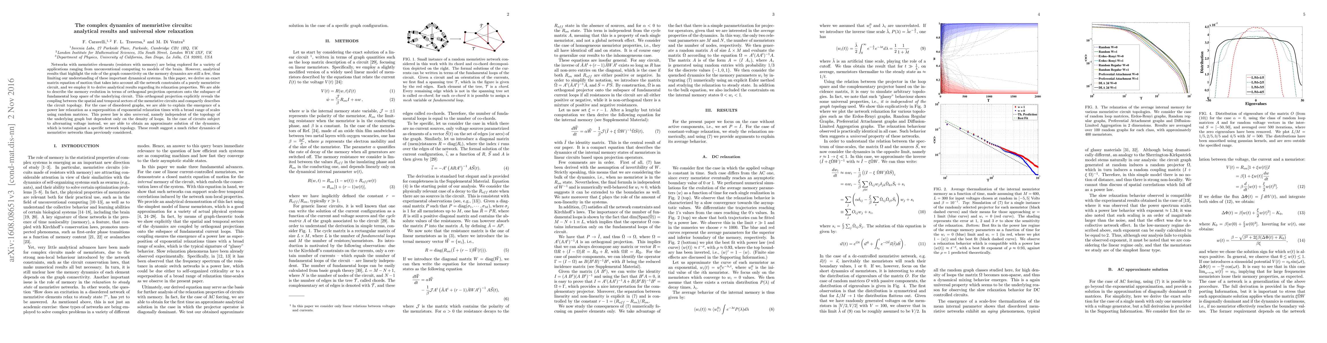 This paper derives an exact matrix equation for memristive circuits, revealing the coupling between spatial and temporal dynamics and describing memory evolution through orthogonal projection. It shows that disordered memristive networks exhibit universal slow relaxation, independent of topology but dependent on loop density.