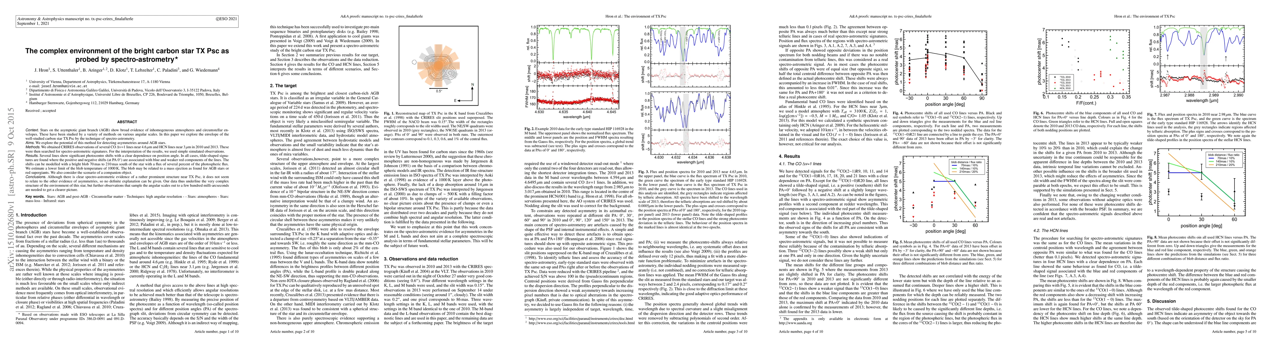 Context: Stars on the asymptotic giant branch (AGB) show broad evidence of inhomogeneous atmospheres and circumstellar envelopes. These have been studied by a variety of methods on various angular scales. In this paper we explore the envelope of the well-studied carbon star TX Psc by the technique of spectro-astrometry. Aims: We explore the potential of this method for detecting asymmetries around AGB stars. Methods:We obtained CRIRES observations of several CO $\Delta$v=1 lines near 4.6 $\mu$m and HCN lines near 3 $\mu$m in 2010 and 2013. These were then searched for spectro-astrometric signatures. For the interpretation of the results, we used simple simulated observations. Results: Several lines show significant photocentre shifts with a clear dependence on position angle. In all cases, tilde-shaped signatures are found where the positive and negative shifts (at PA 0deg) are associated with blue and weaker red components of the lines. The shifts can be modelled with a bright blob 70 mas to 210 mas south of the star with a flux of several percent of the photospheric flux. We estimate a lower limit of the blob temperature of 1000 K. The blob may be related to a mass ejection as found for AGB stars or red supergiants. We also consider the scenario of a companion object. Conclusions: Although there is clear spectro-astrometric evidence of a rather prominent structure near TX Psc, it does not seem to relate to the other evidence of asymmetries, so no definite explanation can be given. Our data thus underline the very complex structure of the environment of this star, but further observations that sample the angular scales out to a few hundred milli-arcseconds are needed to get a clearer picture.