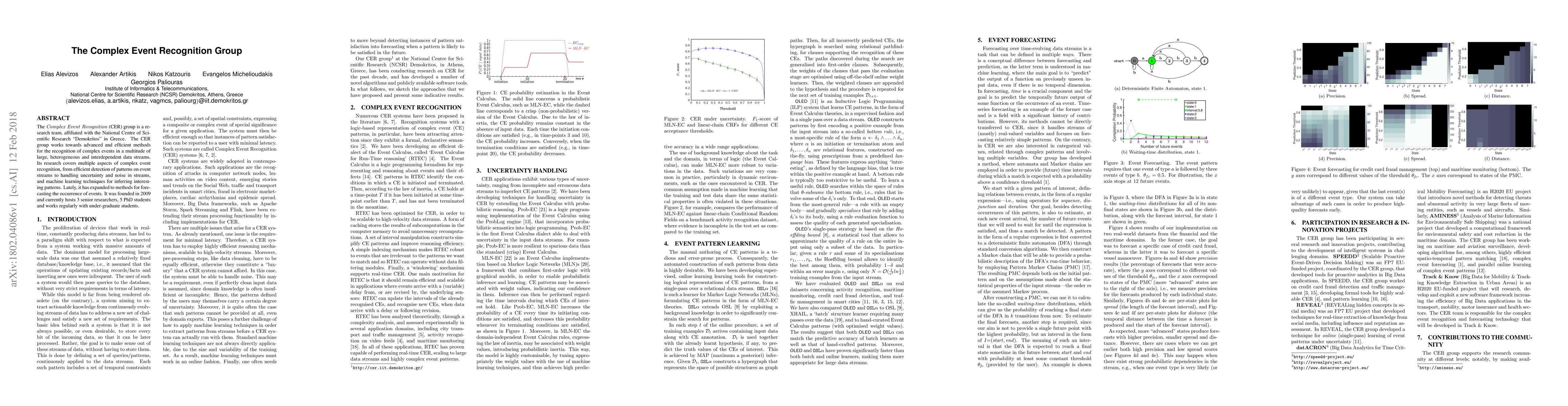The Complex Event Recognition (CER) group at the National Centre of Scientific Research "Demokritos" in Greece develops advanced methods for recognizing complex events in large, heterogeneous data streams, focusing on pattern detection, uncertainty handling, and forecasting. Established in 2009, the group comprises 3 senior researchers, 5 PhD students, and collaborates with undergraduates.