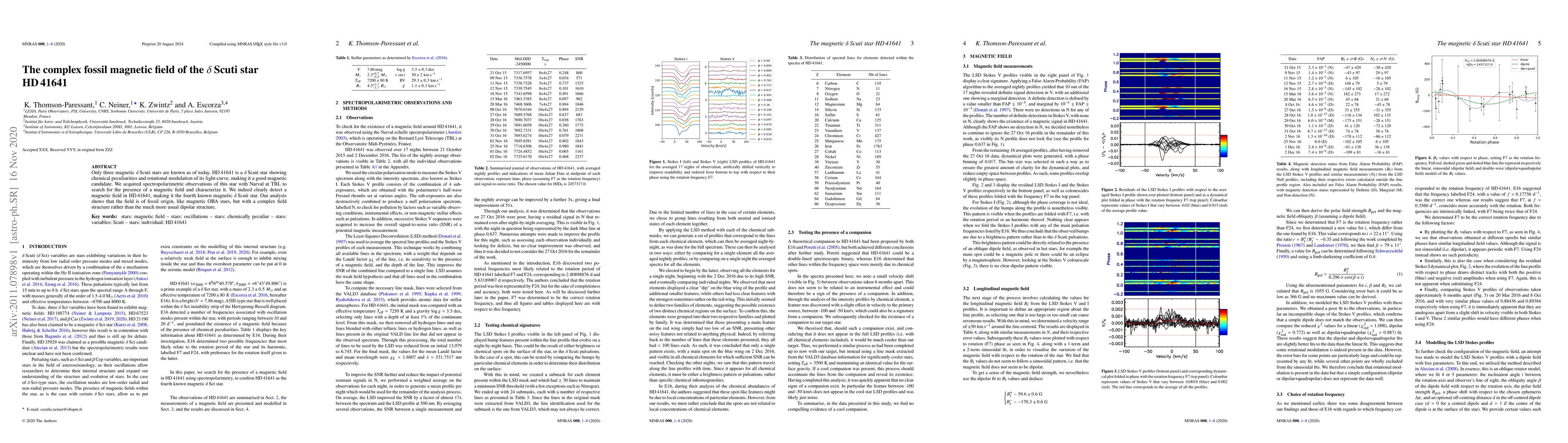 This paper reports the detection of a fossil magnetic field in the $\delta$ Scuti star HD 41641, making it the fourth known magnetic $\delta$ Scuti star. The magnetic field exhibits a complex structure, differing from the typical dipolar configuration found in magnetic OBA stars.