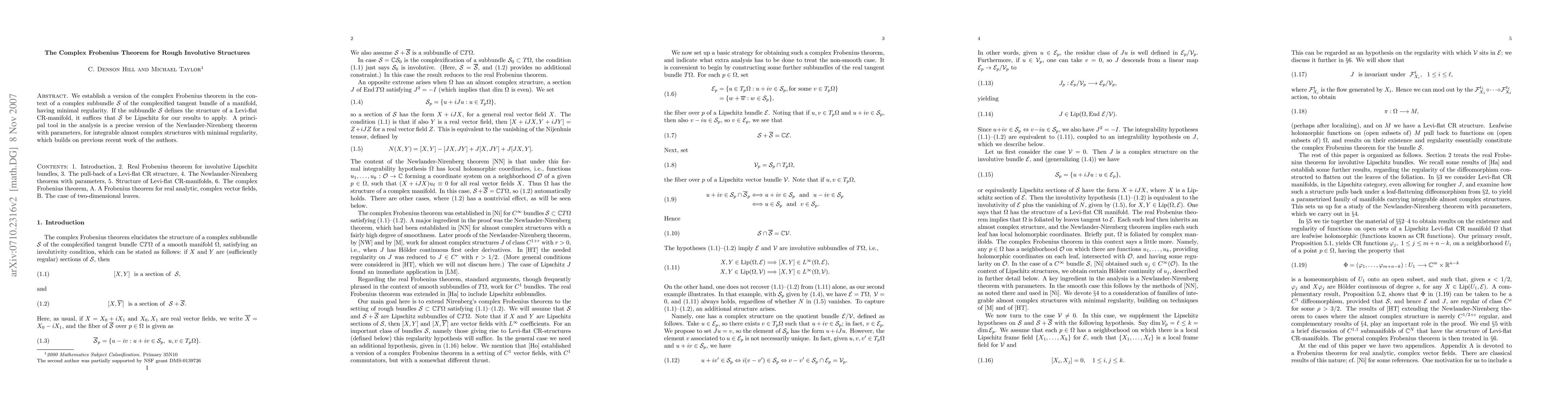 This paper establishes a version of the complex Frobenius theorem for rough involutive structures, showing that a Lipschitz subbundle S in the complexified tangent bundle can define a Levi-flat CR-manifold structure. The analysis leverages a refined Newlander-Nirenberg theorem for minimal regularity almost complex structures.