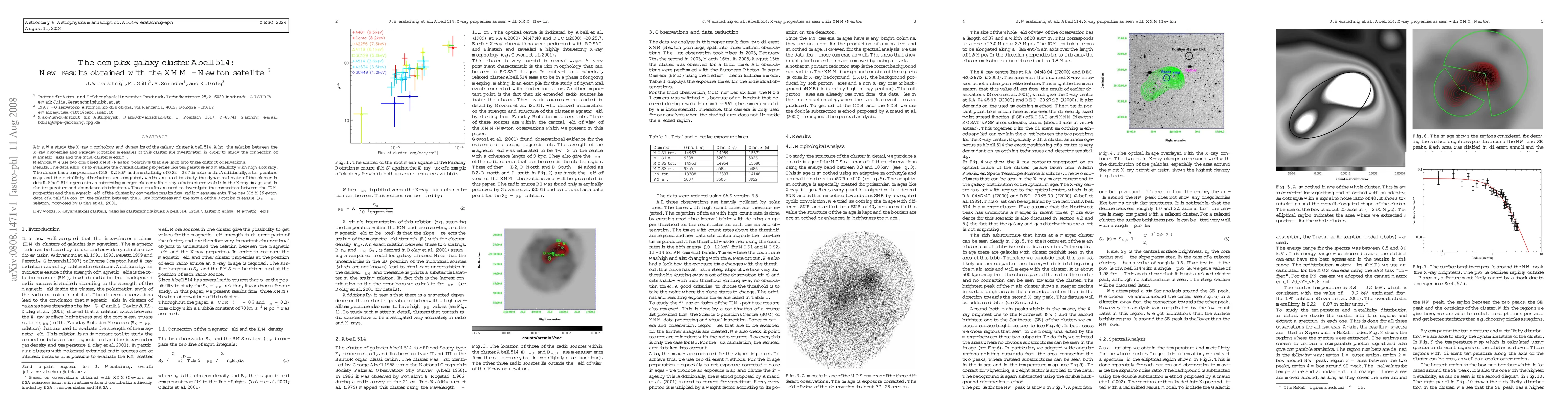 We study the X-ray morphology and dynamics of the galaxy cluster Abell 514. Also, the relation between the X-ray properties and Faraday Rotation measures of this cluster are investigated in order to study the connection of magnetic fields and the intra-cluster medium. We use two combined XMM - Newton pointings that are split into three distinct observations. The data allow us to evaluate the overall cluster properties like temperature and metallicity with high accuracy. Additionally, a temperature map and the metallicity distribution are computed, which are used to study the dynamical state of the cluster in detail. Abell 514 represents an interesting merger cluster with many substructures visible in the X-ray image and in the temperature and abundance distributions. The new XMM - Newton data of Abell 514 confirm the relation between the X-ray brightness and the sigma of the Rotation Measure (S_X - sigma_RM relation) proposed by Dolag et al. (2001).