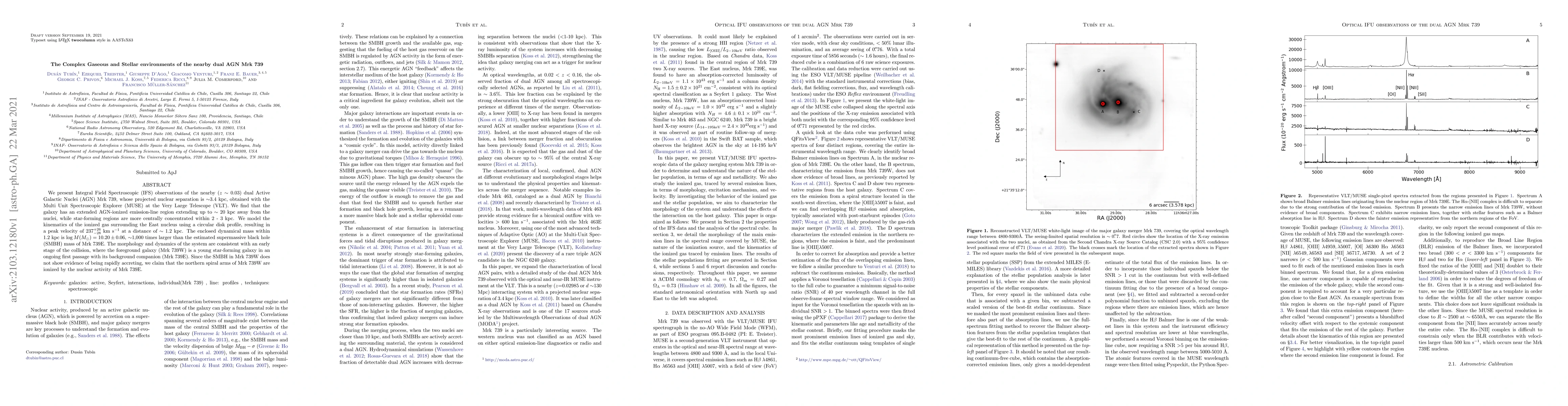 We present Integral Field Spectroscopic (IFS) observations of the nearby ($z\sim0.03$) dual Active Galactic Nuclei (AGN) Mrk 739, whose projected nuclear separation is $\sim$3.4~kpc, obtained with the Multi Unit Spectroscopic Explorer (MUSE) at the Very Large Telescope (VLT). We find that the galaxy has an extended AGN-ionized emission-line region extending up to $\sim 20$ kpc away from the nuclei, while star-forming regions are more centrally concentrated within 2 - 3 kpc. We model the kinematics of the ionized gas surrounding the East nucleus using a circular disk profile, resulting in a peak velocity of $237^{+26}_{-28}$ km s$^{-1}$ at a distance of $\sim 1.2$ kpc. The enclosed dynamical mass within 1.2 kpc is $\log M(M_{\odot})=10.20\pm0.06$, $\sim$1,000 times larger than the estimated supermassive black hole (SMBH) mass of Mrk 739E. The morphology and dynamics of the system are consistent with an early stage of the collision, where the foreground galaxy (Mrk 739W) is a young star-forming galaxy in an ongoing first passage with its background companion (Mrk 739E). Since the SMBH in Mrk 739W does not show evidence of being rapidly accreting, we claim that the northern spiral arms of Mrk 739W are ionized by the nuclear activity of Mrk 739E.