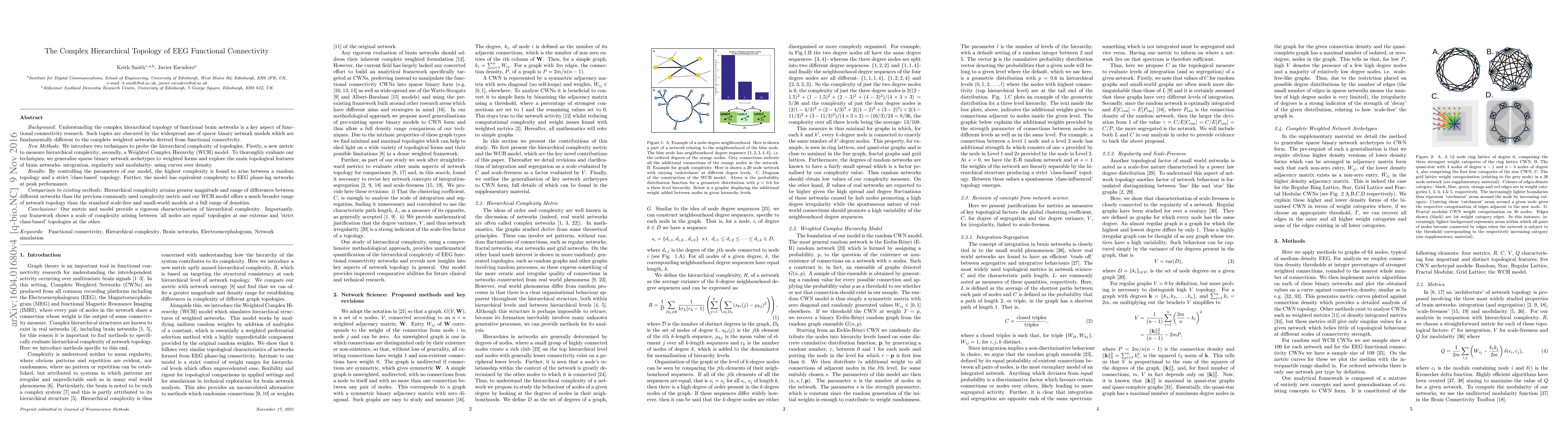 This paper introduces new techniques to measure and model the hierarchical complexity of EEG functional connectivity networks, revealing that the highest complexity arises between random and strict class-based topologies. The proposed Weighted Complex Hierarchy (WCH) model and metric provide a more comprehensive characterization of network topology than traditional models.