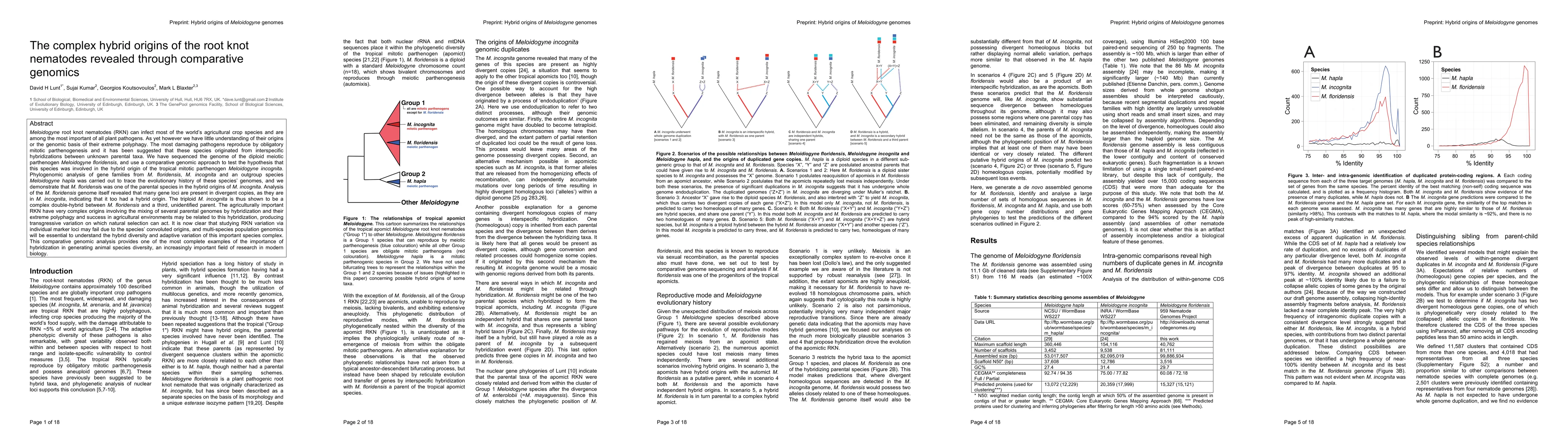 Meloidogyne root knot nematodes (RKN) can infect most of the world's agricultural crop species and are among the most important of all plant pathogens. As yet however we have little understanding of their origins or the genomic basis of their extreme polyphagy. The most damaging pathogens reproduce by mitotic parthenogenesis and are suggested to originate by interspecific hybridizations between unknown parental taxa. We sequenced the genome of the diploid meiotic parthenogen Meloidogyne floridensis, and use a comparative genomic approach to test the hypothesis that it was involved in the hybrid origin of the tropical mitotic parthenogen M. incognita. Phylogenomic analysis of gene families from M. floridensis, M. incognita and an outgroup species M. hapla was used to trace the evolutionary history of these species' genomes, demonstrating that M. floridensis was one of the parental species in the hybrid origins of M. incognita. Analysis of the M. floridensis genome revealed many gene loci present in divergent copies, as they are in M. incognita, indicating that it too had a hybrid origin. The triploid M. incognita is shown to be a complex double-hybrid between M. floridensis and a third, unidentified parent. The agriculturally important RKN have very complex origins involving the mixing of several parental genomes by hybridization and their extreme polyphagy and agricultural success may be related to this hybridization, producing transgressive variation on which natural selection acts. Studying RKN variation via individual marker loci may fail due to the species' convoluted origins, and multi-species population genomics is essential to understand the hybrid diversity and adaptive variation of this important species complex. This comparative genomic analysis provides a compelling example of the importance and complexity of hybridization in generating animal species diversity more generally.