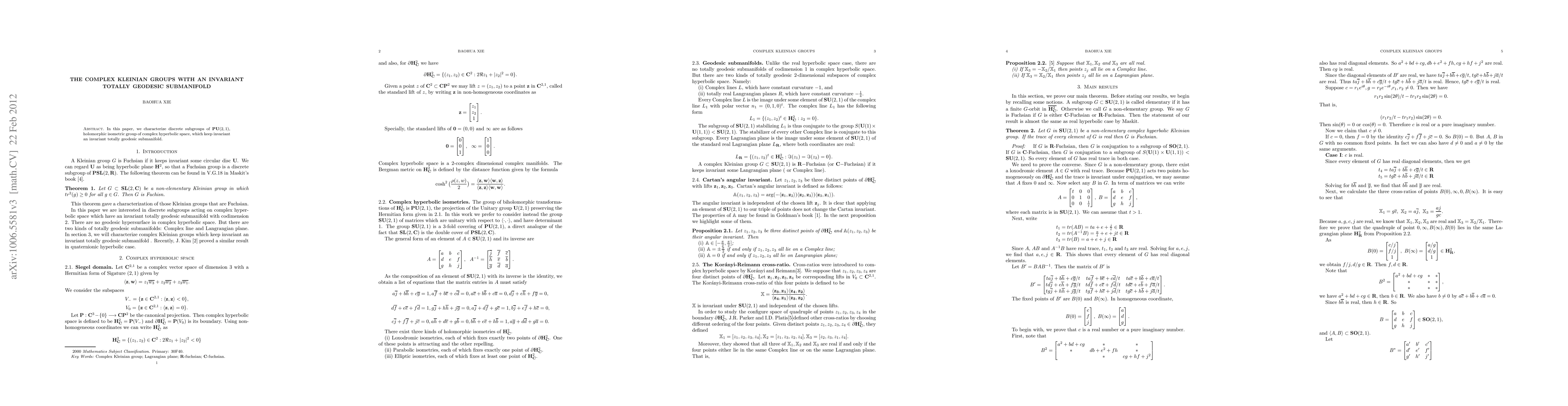 Summary: This paper characterizes discrete subgroups of the holomorphic isometry group of complex hyperbolic space, PU(2,1), that possess an invariant totally geodesic submanifold. The focus is on understanding the structure and properties of these complex hyperbolic Kleinian groups.