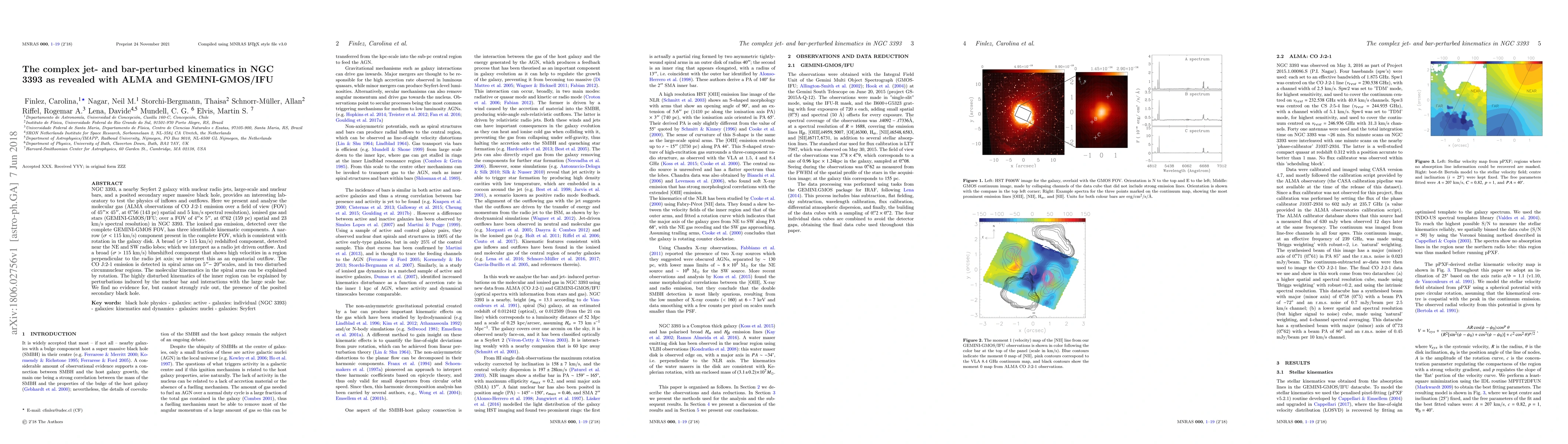 NGC 3393, a nearby Seyfert 2 galaxy with nuclear radio jets, large-scale and nuclear bars, and a posited secondary super massive black hole, provides an interesting laboratory to test the physics of inflows and outflows. Here we present and analyse the molecular gas (ALMA observations of CO J:2-1 emission over a field of view (FOV) of 45\arcsec \times 45\arcsec, at 0\farcs56 (143 pc) spatial and 5 km/s spectral resolution), ionised gas and stars (GEMINI-GMOS/IFU; over a FOV of 4\arcsec \times 5\arcsec, at 0\farcs62 (159 pc) spatial and 23 km/s spectral resolution) in NGC 3393. The ionised gas emission, detected over the complete GEMINI-GMOS FOV, has three identifiable kinematic components. A narrow (\sigma < 115 km/s) component present in the complete FOV, which is consistent with rotation in the galaxy disk. A broad (\sigma > 115 km/s) redshifted component, detected near the NE and SW radio lobes; which we interpret as a radio jet driven outflow. And a broad (\sigma > 115 km/s) blueshifted component that shows high velocities in a region perpendicular to the radio jet axis; we interpret this as an equatorial outflow. The CO J:2-1 emission is detected in spiral arms on 5\arcsec - 20\arcsec scales, and in two disturbed circumnuclear regions. The molecular kinematics in the spiral arms can be explained by rotation. The highly disturbed kinematics of the inner region can be explained by perturbations induced by the nuclear bar and interactions with the large scale bar. We find no evidence for, but cannot strongly rule out, the presence of the posited secondary black hole.