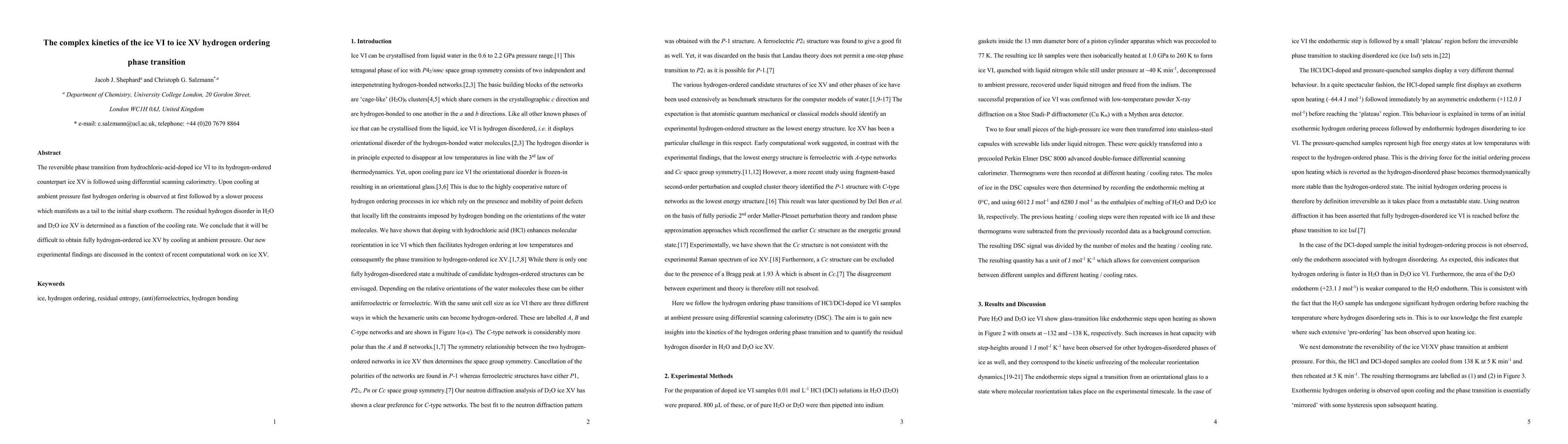 The study investigates the kinetics of the phase transition from hydrochloric-acid-doped ice VI to hydrogen-ordered ice XV using differential scanning calorimetry, revealing a complex process with initial fast hydrogen ordering followed by a slower tailing effect. It concludes that achieving fully ordered ice XV at ambient pressure is challenging.