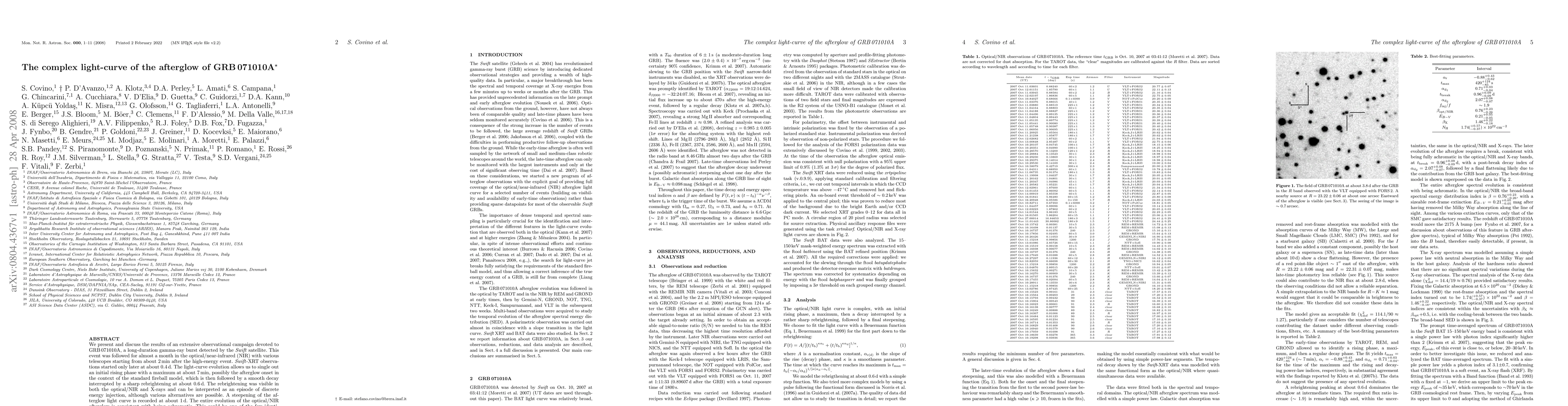 We present and discuss the results of an extensive observational campaign devoted to GRB071010A, a long-duration gamma-ray burst detected by the Swift satellite. This event was followed for almost a month in the optical/near-infrared (NIR) with various telescopes starting from about 2min after the high-energy event. Swift-XRT observations started only later at about 0.4d. The light-curve evolution allows us to single out an initial rising phase with a maximum at about 7min, possibly the afterglow onset in the context of the standard fireball model, which is then followed by a smooth decay interrupted by a sharp rebrightening at about 0.6d. The rebrightening was visible in both the optical/NIR and X-rays and can be interpreted as an episode of discrete energy injection, although various alternatives are possible. A steepening of the afterglow light curve is recorded at about 1d. The entire evolution of the optical/NIR afterglow is consistent with being achromatic. This could be one of the few identified GRB afterglows with an achromatic break in the X-ray through the optical/NIR bands. Polarimetry was also obtained at about 1d, just after the rebrightening and almost coincident with the steepening. This provided a fairly tight upper limit of 0.9% for the polarized-flux fraction.