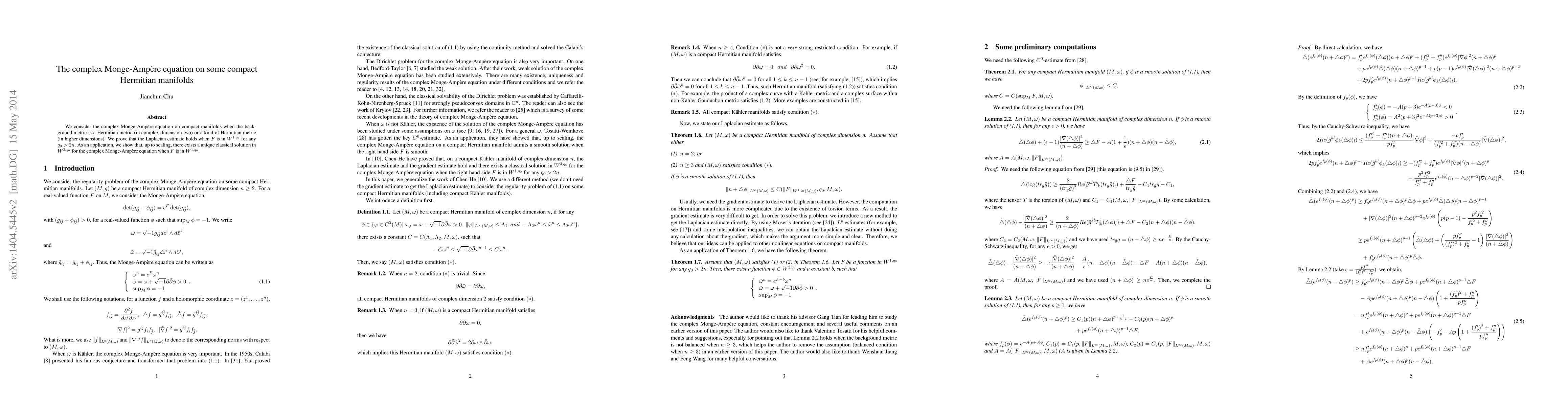 We consider the complex Monge-Amp\`{e}re equation on compact manifolds when the background metric is a Hermitian metric (in complex dimension two) or a kind of Hermitian metric (in higher dimensions). We prove that the Laplacian estimate holds when $F$ is in $W^{1,q_{0}}$ for any $q_{0}>2n$. As an application, we show that, up to scaling, there exists a unique classical solution in $W^{3,q_{0}}$ for the complex Monge-Amp\`{e}re equation when $F$ is in $W^{1,q_{0}}$.