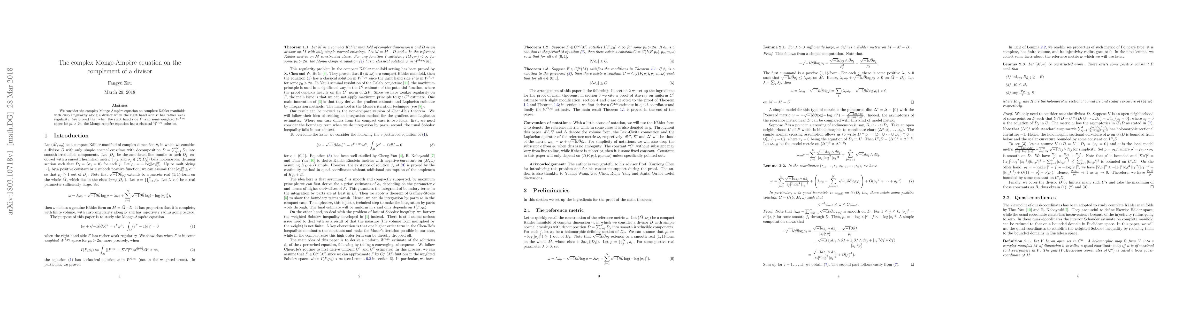 This paper studies the complex Monge-Ampère equation on complete Kähler manifolds with cusp singularities along a divisor, proving the existence of a classical solution when the right-hand side function is in a weighted $W^{1,p_0}$ space for $p_0 > 2n$.
