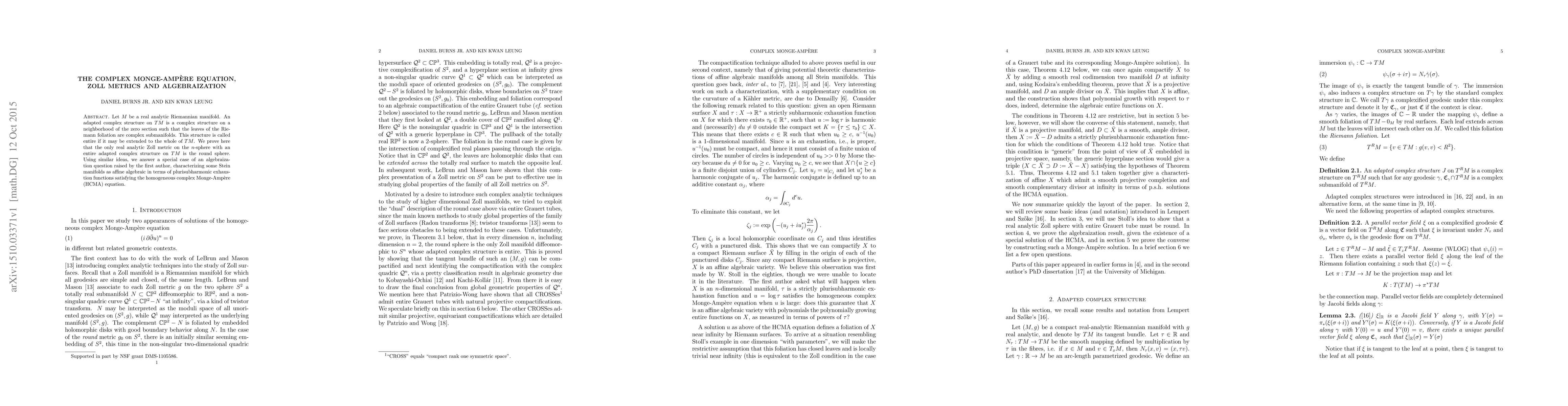 Let M be a real analytic Riemannian manifold. An adapted complex structure on $TM$ is a complex structure on a neighborhood of the zero section such that the leaves of the Riemann foliation are complex submanifolds. This structure is called entire if it may be extended to the whole of $TM$. We prove here that the only real analytic Zoll metric on the $n$-sphere with an entire adapted complex structure on $TM$ is the round sphere. Using similar ideas, we answer a special case of an algebraization question raised by the first author, characterizing some Stein manifolds as affine algebraic in terms of plurisubharmonic exhaustion functions satisfying the homogeneous complex Monge-Amp\`ere (HCMA) equation.