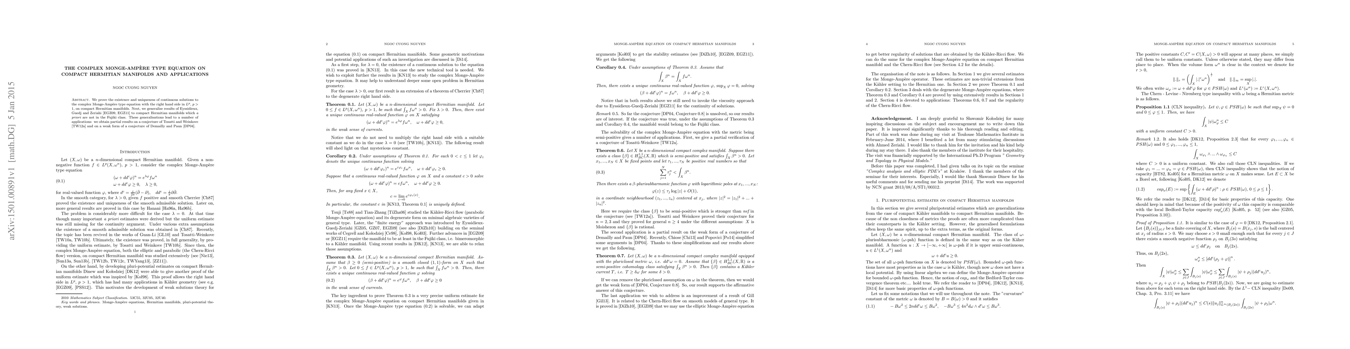The paper proves the existence and uniqueness of continuous solutions to the complex Monge-Ampère type equation on compact Hermitian manifolds, extending prior results to manifolds not necessarily in the Fujiki class, and applies these findings to conjectures in the field.