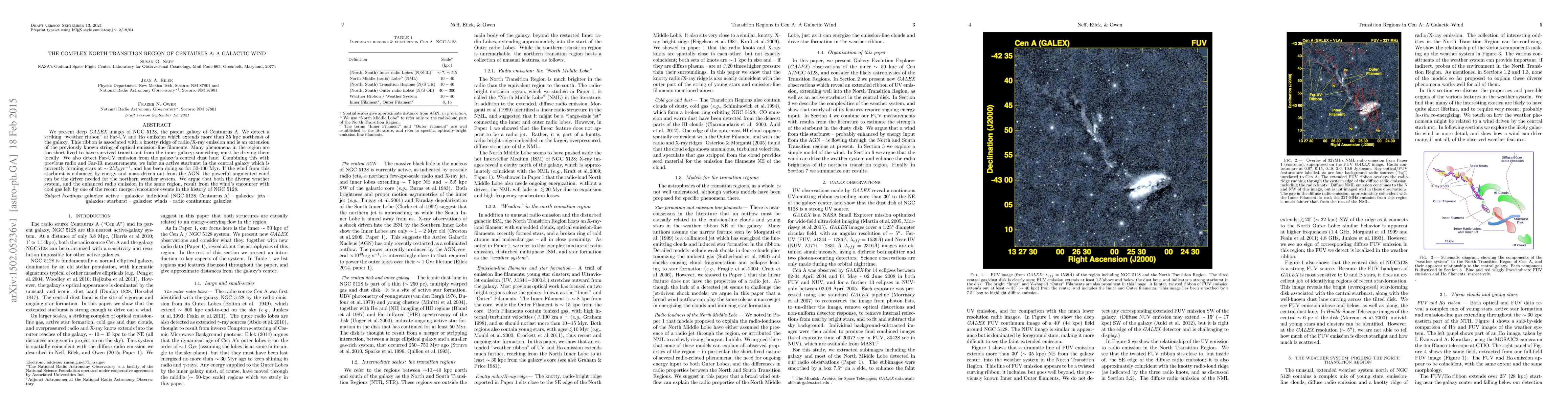 This paper investigates NGC 5128 (Centaurus A) and identifies a "weather ribbon" of Far-UV and H$\alpha$ emission extending over 35 kpc northeast of the galaxy, suggesting a powerful galactic wind driven by an active starburst and possibly augmented by AGN activity. The wind's interaction with cool gas from recent merger events likely generates the observed diverse emission phenomena.