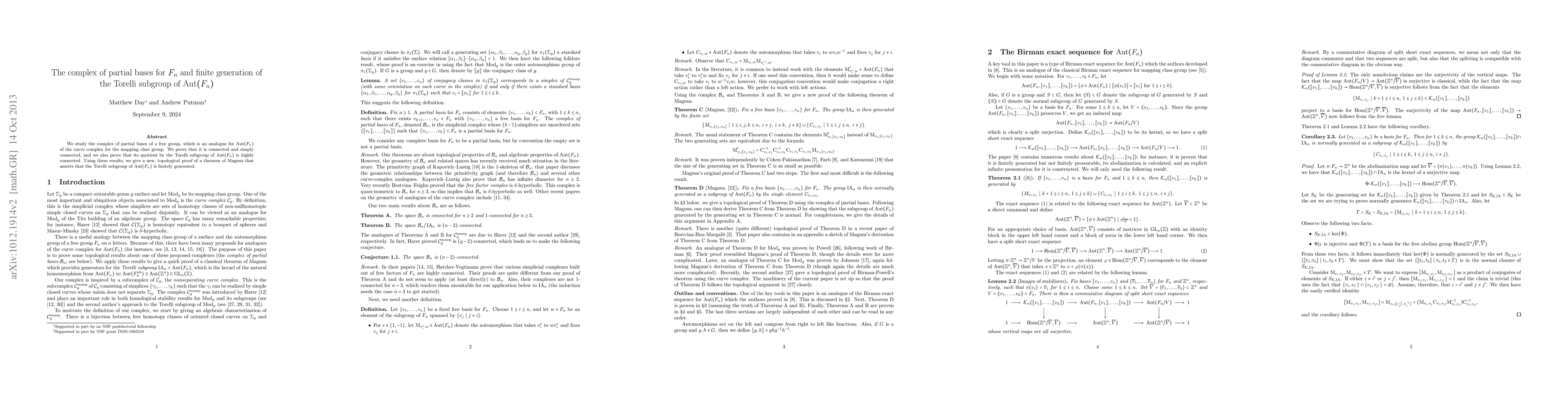 This paper investigates the complex of partial bases for a free group $F_n$, showing it is connected and simply connected. It also proves that the quotient by the Torelli subgroup yields a highly connected space, leading to a new topological proof that the Torelli subgroup is finitely generated.