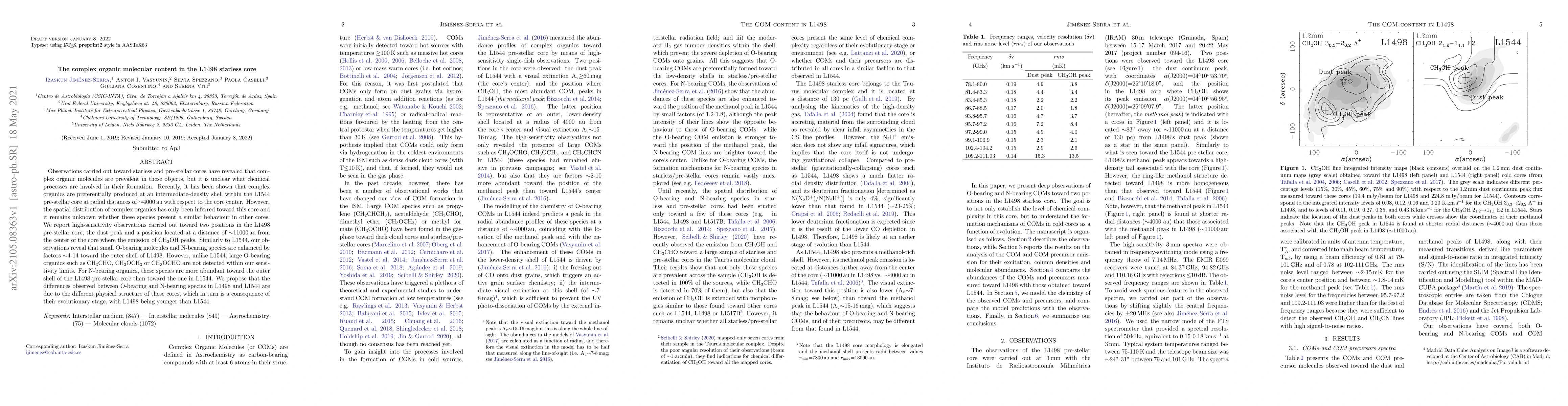 Observations carried out toward starless and pre-stellar cores have revealed that complex organic molecules are prevalent in these objects, but it is unclear what chemical processes are involved in their formation. Recently, it has been shown that complex organics are preferentially produced at an intermediate-density shell within the L1544 pre-stellar core at radial distances of ~4000 au with respect to the core center. However, the spatial distribution of complex organics has only been inferred toward this core and it remains unknown whether these species present a similar behaviour in other cores. We report high-sensitivity observations carried out toward two positions in the L1498 pre-stellar core, the dust peak and a position located at a distance of ~11000 au from the center of the core where the emission of CH$_3$OH peaks. Similarly to L1544, our observations reveal that small O-bearing molecules and N-bearing species are enhanced by factors ~4-14 toward the outer shell of L1498. However, unlike L1544, large O-bearing organics such as CH3CHO, CH3OCH3 or CH3OCHO are not detected within our sensitivity limits. For N-bearing organics, these species are more abundant toward the outer shell of the L1498 pre-stellar core than toward the one in L1544. We propose that the differences observed between O-bearing and N-bearing species in L1498 and L1544 are due to the different physical structure of these cores, which in turn is a consequence of their evolutionary stage, with L1498 being younger than L1544.