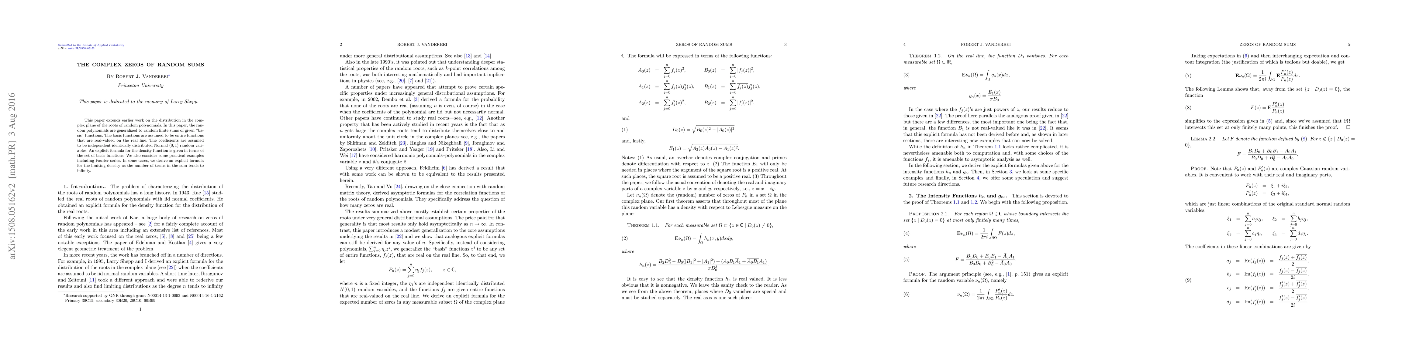This paper extends earlier work on the distribution in the complex plane of the roots of random polynomials. In this paper, the random polynomials are generalized to random finite sums of given "basis" functions. The basis functions are assumed to be entire functions that are real-valued on the real line. The coefficients are assumed to be independent identically distributed Normal $(0,1)$ random variables. An explicit formula for the density function is given in terms of the set of basis functions. We also consider some practical examples including Fourier series. In some cases, we derive an explicit formula for the limiting density as the number of terms in the sum tends to infinity.
