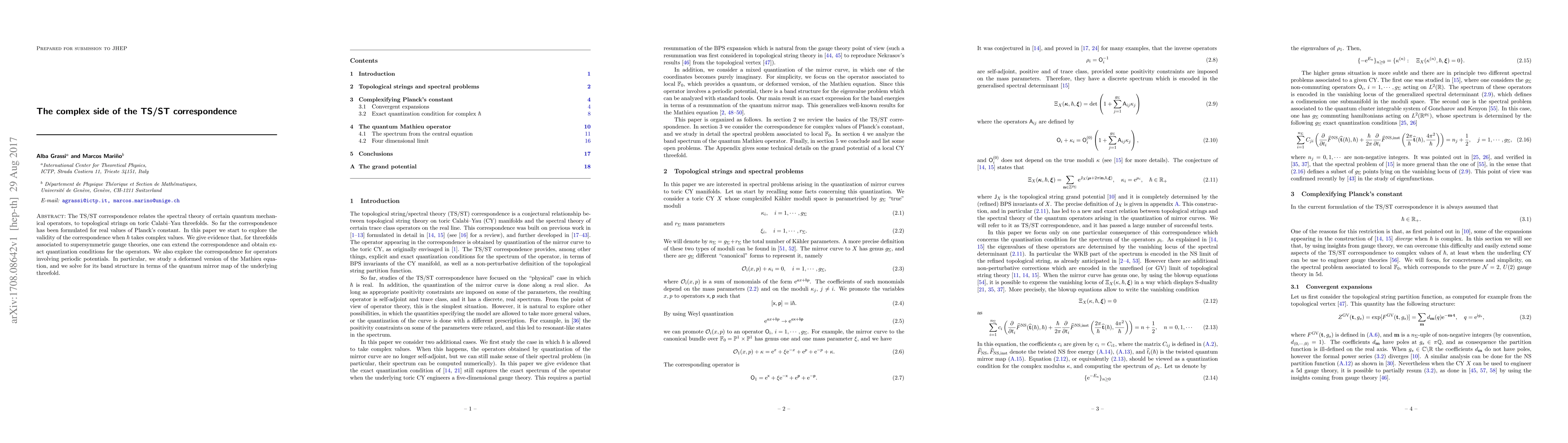 The TS/ST correspondence relates the spectral theory of certain quantum mechanical operators, to topological strings on toric Calabi-Yau threefolds. So far the correspondence has been formulated for real values of Planck's constant. In this paper we start to explore the validity of the correspondence when $\hbar$ takes complex values. We give evidence that, for threefolds associated to supersymmetric gauge theories, one can extend the correspondence and obtain exact quantization conditions for the operators. We also explore the correspondence for operators involving periodic potentials. In particular, we study a deformed version of the Mathieu equation, and we solve for its band structure in terms of the quantum mirror map of the underlying threefold.
