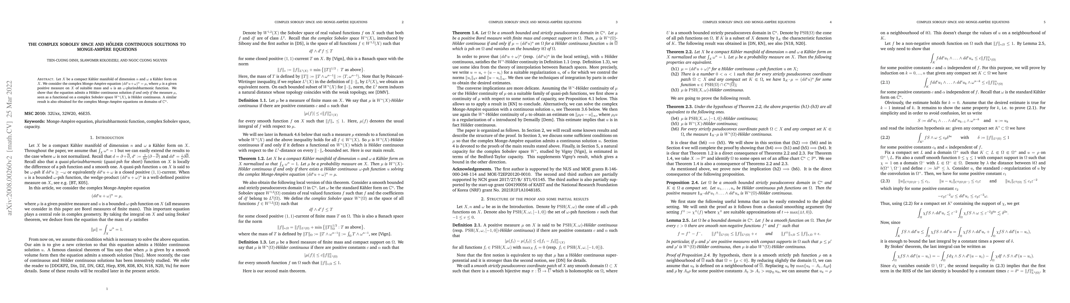 This paper investigates the complex Monge-Ampère equation on compact Kähler manifolds, proving that it admits a Hölder continuous solution if and only if the associated measure is Hölder continuous in a complex Sobolev space. The result extends to complex Monge-Ampère equations on domains in $\mathbb{C}^n$.