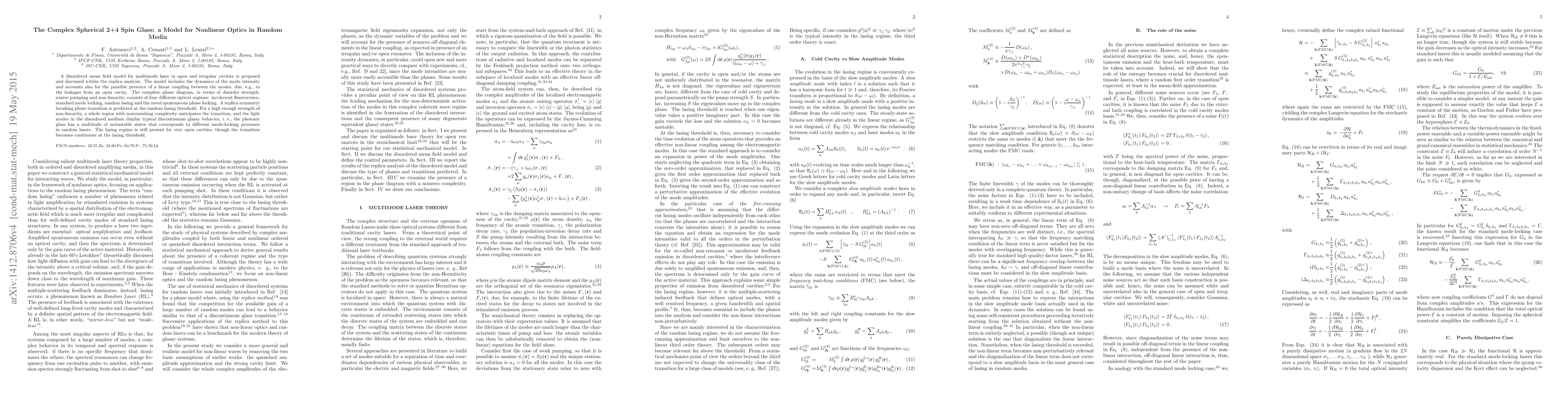 A disordered mean field model for multimode laser in open and irregular cavities is proposed and discussed within the replica analysis. The model includes the dynamics of the mode intensity and accounts also for the possible presence of a linear coupling between the modes, due, e.g., to the leakages from an open cavity. The complete phase diagram, in terms of disorder strength, source pumping and non-linearity, consists of four different optical regimes: incoherent fluorescence, standard mode locking, random lasing and the novel spontaneous phase locking. A replica symmetry breaking phase transition is predicted at the random lasing threshold. For a high enough strength of non-linearity, a whole region with nonvanishing complexity anticipates the transition, and the light modes in the disordered medium display typical discontinuous glassy behavior, i.e., the photonic glass has a multitude of metastable states that corresponds to different mode-locking processes in random lasers. The lasing regime is still present for very open cavities, though the transition becomes continuous at the lasing threshold.