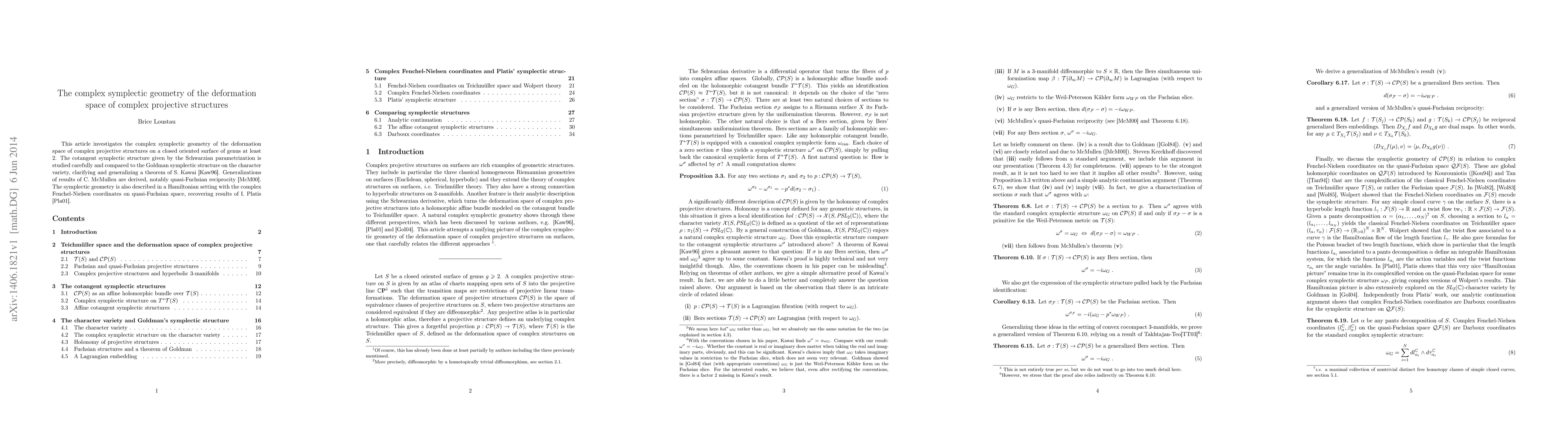 This paper explores the complex symplectic geometry of deformation spaces for complex projective structures on closed oriented surfaces, comparing the Schwarzian parametrization's cotangent structure to the Goldman symplectic structure, and deriving generalizations of quasi-Fuchsian reciprocity and results from I. Platis in a Hamiltonian framework.
