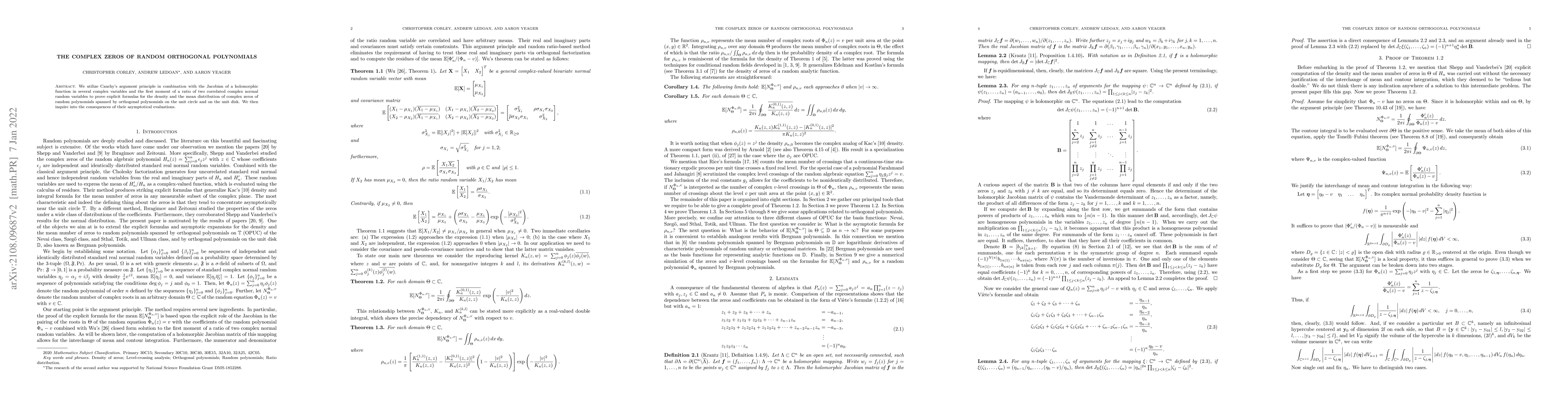 This paper employs Cauchy's argument principle and the Jacobian of a holomorphic function to derive explicit formulas for the density and mean distribution of complex zeros of random orthogonal polynomials. It further explores the implications of these asymptotic evaluations.