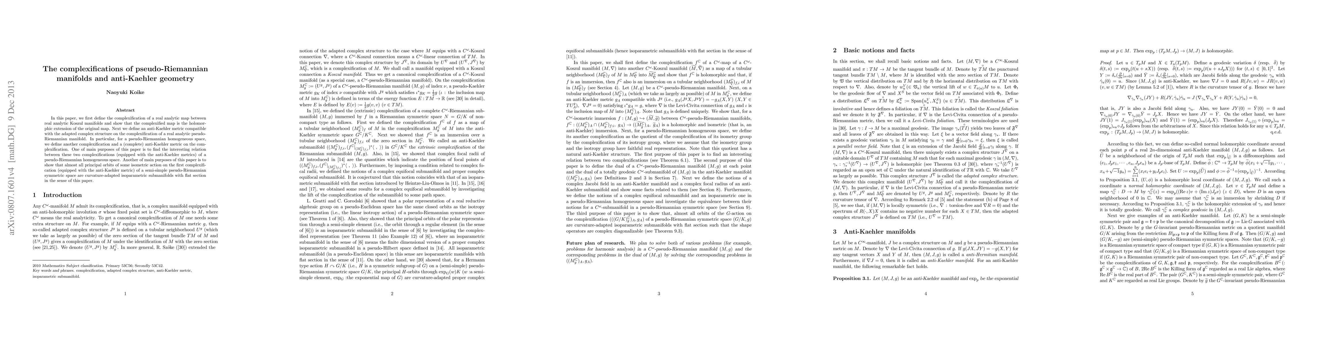 This paper explores complexifications of real analytic maps between Koszul manifolds, demonstrating holomorphic extensions, and introduces anti-Kaehler metrics compatible with adapted complex structures on pseudo-Riemannian manifolds. It investigates relationships between two complexifications of pseudo-Riemannian homogeneous spaces and proves that almost all principal orbits of certain isometric actions on the first complexification are curvature-adapted isoparametric submanifolds.