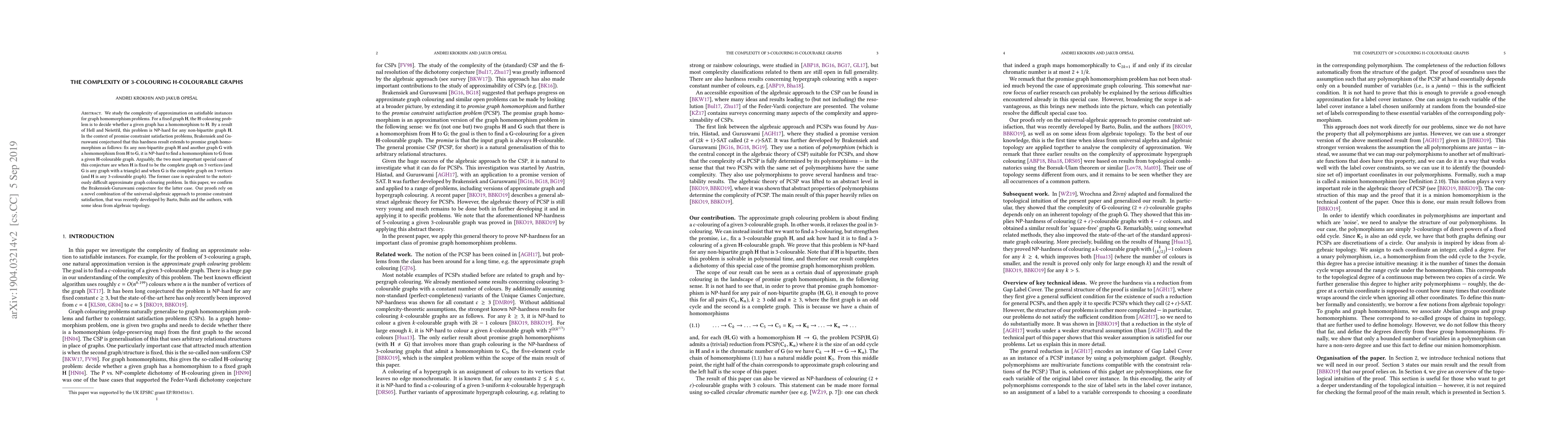 We study the complexity of approximation on satisfiable instances for graph homomorphism problems. For a fixed graph $H$, the $H$-colouring problem is to decide whether a given graph has a homomorphism to $H$. By a result of Hell and Ne\v{s}et\v{r}il, this problem is NP-hard for any non-bipartite graph $H$. In the context of promise constraint satisfaction problems, Brakensiek and Guruswami conjectured that this hardness result extends to promise graph homomorphism as follows: fix any non-bipartite graph $H$ and another graph $G$ with a homomorphism from $H$ to $G$, it is NP-hard to find a homomorphism to $G$ from a given $H$-colourable graph. Arguably, the two most important special cases of this conjecture are when $H$ is fixed to be the complete graph on 3 vertices (and $G$ is any graph with a triangle) and when $G$ is the complete graph on 3 vertices (and $H$ is any 3-colourable graph). The former case is equivalent to the notoriously difficult approximate graph colouring problem. In this paper, we confirm the Brakensiek-Guruswami conjecture for the latter case. Our proofs rely on a novel combination of the universal-algebraic approach to promise constraint satisfaction, that was recently developed by Barto, Bul\'in and the authors, with some ideas from algebraic topology.
