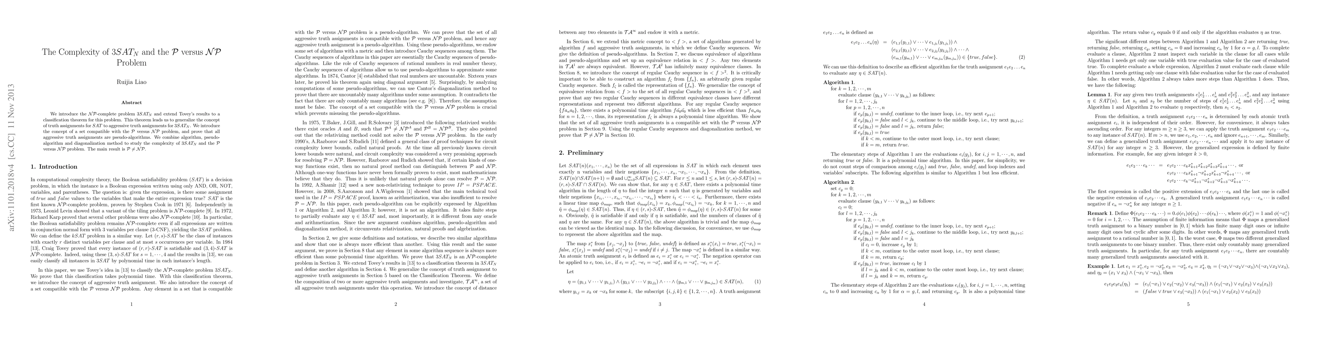 This paper introduces the NP-complete problem 3SAT_N and provides a classification theorem based on aggressive truth assignments, proving that these are pseudo-algorithms. It combines algorithmic methods to argue for the complexity of 3SAT_N and concludes that P is not equal to NP.