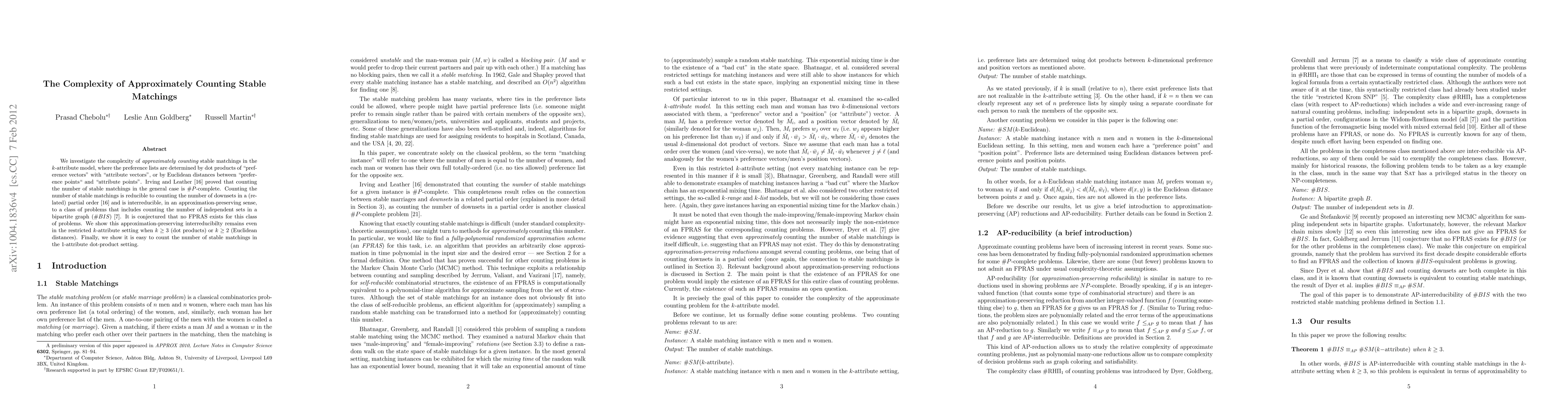 The paper investigates the complexity of approximately counting stable matchings in the k-attribute model using dot products and Euclidean distances, proving approximation-preserving interreducibility with a conjectured #P-complete problem class.