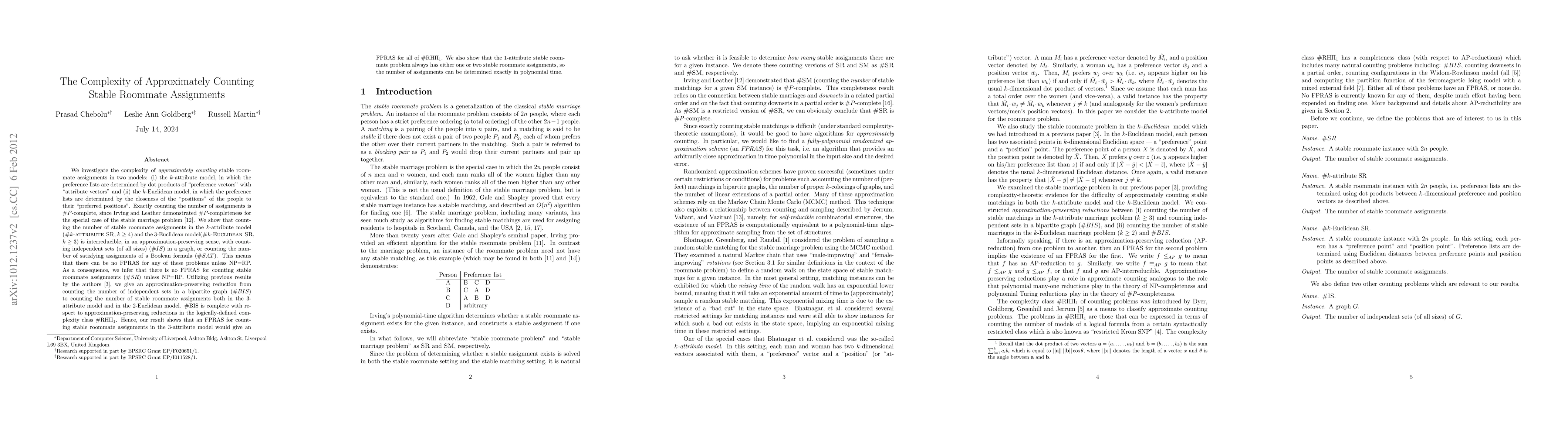 The paper establishes approximation-preserving reductions between stable roommate counting problems and #IS, #SAT, and #BIS, thereby linking the complexity of these problems.