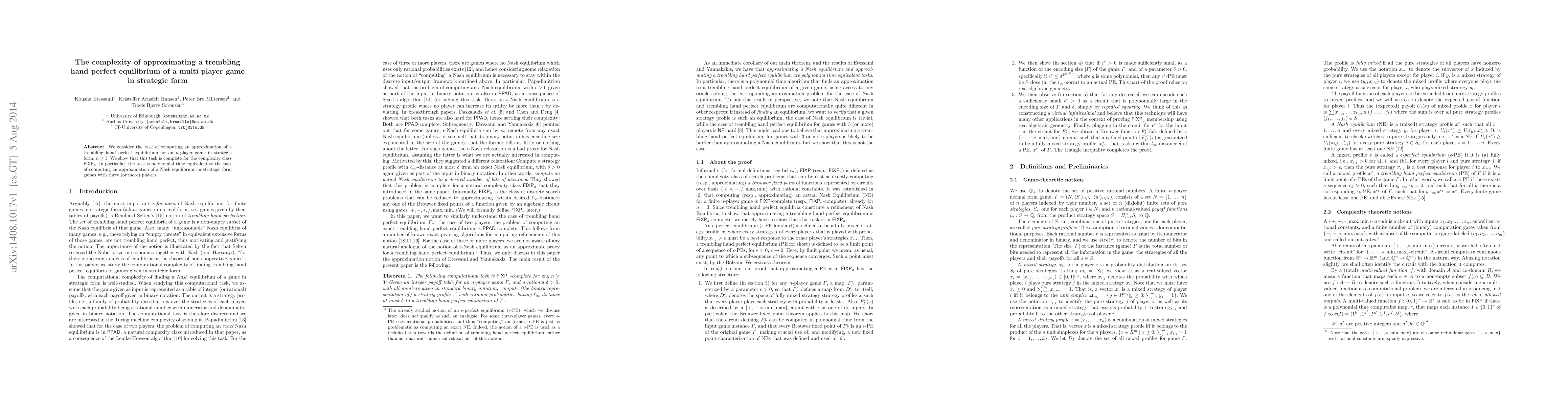 This paper explores the complexity of approximating a trembling hand perfect equilibrium in multi-player strategic form games, demonstrating its equivalence to computing Nash equilibria in such games, and classifying it as complete for the complexity class FIXP_a.