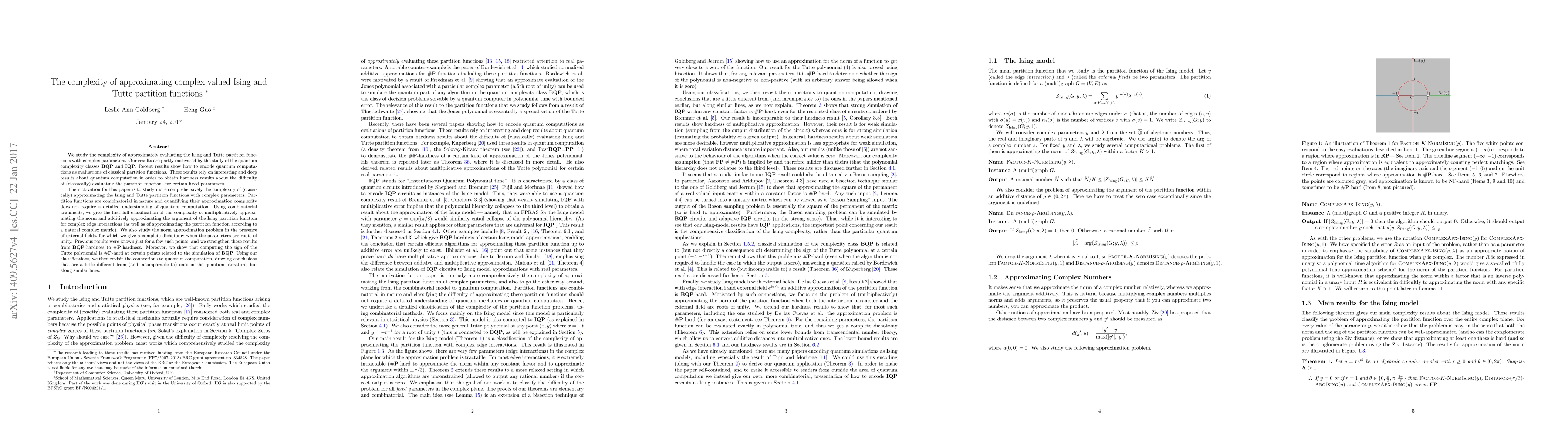 We study the complexity of approximately evaluating the Ising and Tutte partition functions with complex parameters. Our results are partly motivated by the study of the quantum complexity classes BQP and IQP. Recent results show how to encode quantum computations as evaluations of classical partition functions. These results rely on interesting and deep results about quantum computation in order to obtain hardness results about the difficulty of (classically) evaluating the partition functions for certain fixed parameters. The motivation for this paper is to study more comprehensively the complexity of (classically) approximating the Ising and Tutte partition functions with complex parameters. Partition functions are combinatorial in nature and quantifying their approximation complexity does not require a detailed understanding of quantum computation. Using combinatorial arguments, we give the first full classification of the complexity of multiplicatively approximating the norm and additively approximating the argument of the Ising partition function for complex edge interactions (as well as of approximating the partition function according to a natural complex metric). We also study the norm approximation problem in the presence of external fields, for which we give a complete dichotomy when the parameters are roots of unity. Previous results were known just for a few such points, and we strengthen these results from BQP-hardness to #P-hardness. Moreover, we show that computing the sign of the Tutte polynomial is #P-hard at certain points related to the simulation of BQP. Using our classifications, we then revisit the connections to quantum computation, drawing conclusions that are a little different from (and incomparable to) ones in the quantum literature, but along similar lines.