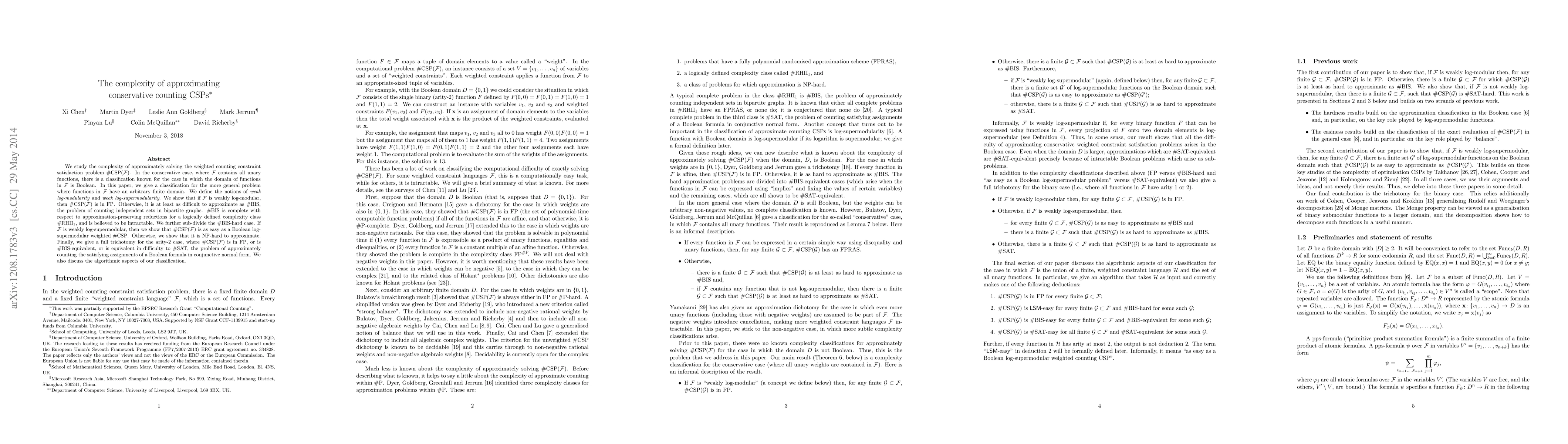 We study the complexity of approximately solving the weighted counting constraint satisfaction problem #CSP(F). In the conservative case, where F contains all unary functions, there is a classification known for the case in which the domain of functions in F is Boolean. In this paper, we give a classification for the more general problem where functions in F have an arbitrary finite domain. We define the notions of weak log-modularity and weak log-supermodularity. We show that if F is weakly log-modular, then #CSP(F)is in FP. Otherwise, it is at least as difficult to approximate as #BIS, the problem of counting independent sets in bipartite graphs. #BIS is complete with respect to approximation-preserving reductions for a logically-defined complexity class #RHPi1, and is believed to be intractable. We further sub-divide the #BIS-hard case. If F is weakly log-supermodular, then we show that #CSP(F) is as easy as a (Boolean) log-supermodular weighted #CSP. Otherwise, we show that it is NP-hard to approximate. Finally, we give a full trichotomy for the arity-2 case, where #CSP(F) is in FP, or is #BIS-equivalent, or is equivalent in difficulty to #SAT, the problem of approximately counting the satisfying assignments of a Boolean formula in conjunctive normal form. We also discuss the algorithmic aspects of our classification.