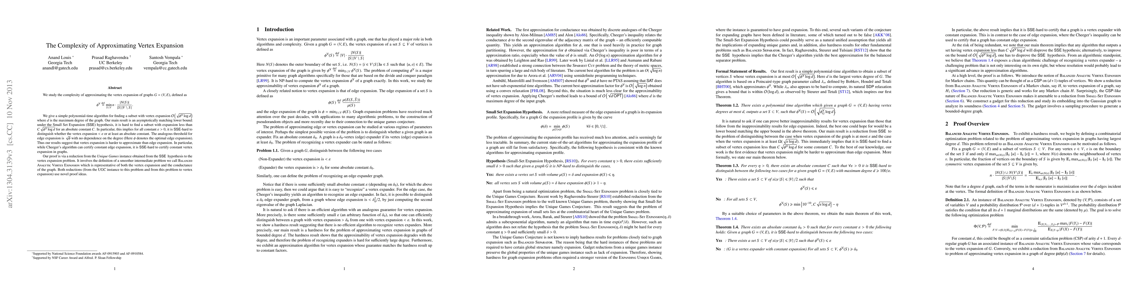 This paper investigates the complexity of approximating vertex expansion in graphs, presenting a polynomial-time algorithm that finds a subset with vertex expansion $O(\sqrt{OPT \log d})$. It establishes an asymptotically matching lower bound under the Small Set Expansion hypothesis, showing that it is hard to find a subset with expansion less than $C\sqrt{OPT \log d}$, indicating vertex expansion is harder to approximate than edge expansion.