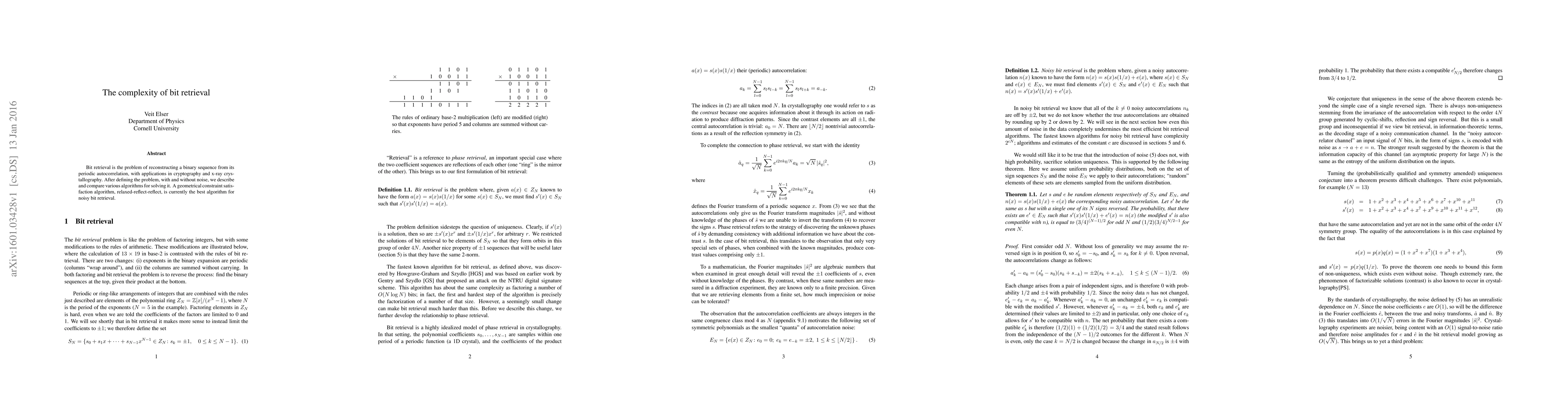 Bit retrieval is the problem of reconstructing a binary sequence from its periodic autocorrelation, with applications in cryptography and x-ray crystallography. After defining the problem, with and without noise, we describe and compare various algorithms for solving it. A geometrical constraint satisfaction algorithm, relaxed-reflect-reflect, is currently the best algorithm for noisy bit retrieval.
