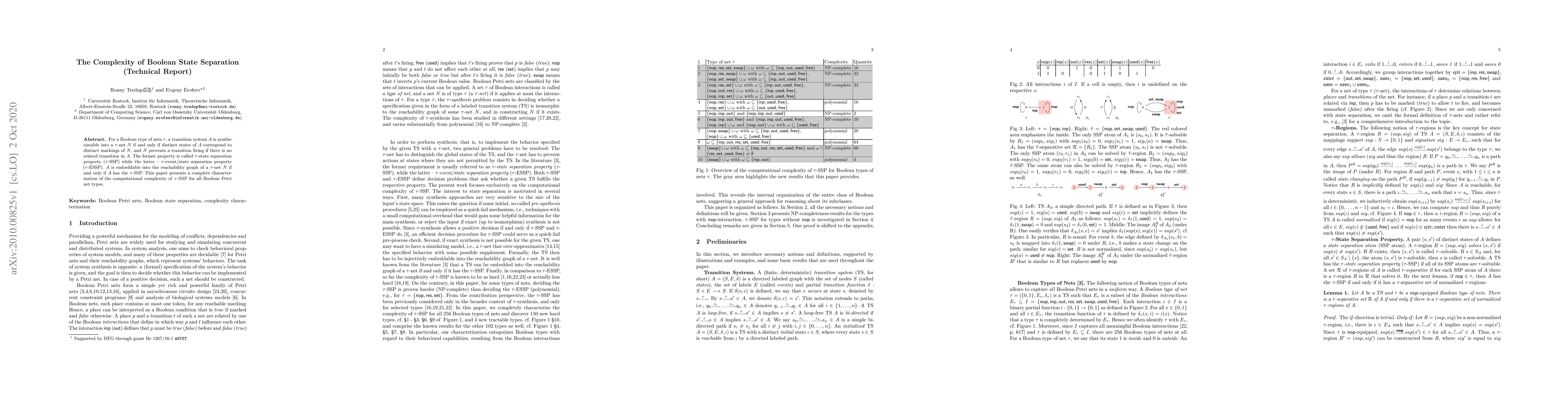 For a Boolean type of nets $\tau$, a transition system $A$ is synthesizeable into a $\tau$-net $N$ if and only if distinct states of $A$ correspond to distinct markings of $N$, and $N$ prevents a transition firing if there is no related transition in $A$. The former property is called $\tau$-state separation property ($\tau$-SSP) while the latter -- $\tau$-event/state separation property ($\tau$-ESSP). $A$ is embeddable into the reachability graph of a $\tau$-net $N$ if and only if $A$ has the $\tau$-SSP. This paper presents a complete characterization of the computational complexity of \textsc{$\tau$-SSP} for all Boolean Petri net types.