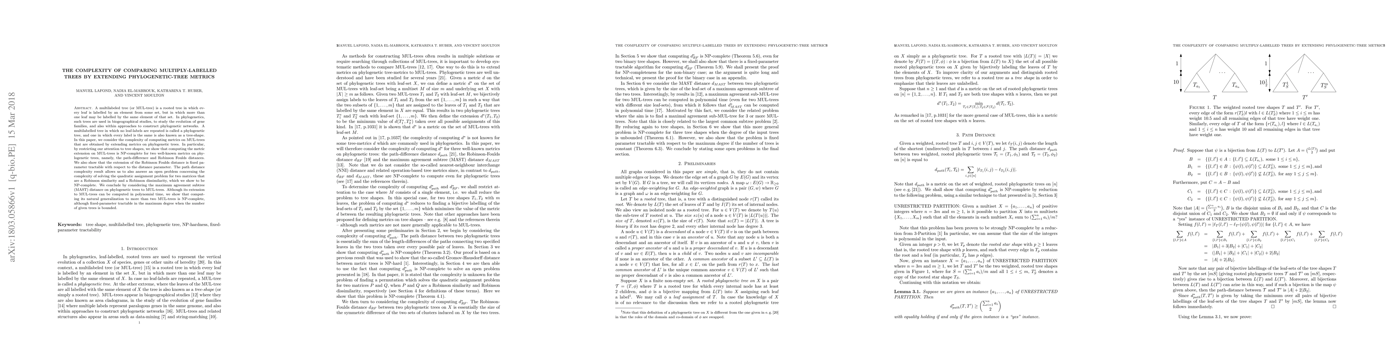 This paper investigates the computational complexity of extending phylogenetic-tree metrics to multiply-labelled trees (MUL-trees), showing that the path-difference and Robinson Foulds distances are NP-complete for MUL-trees. It also demonstrates that the extension of the Robinson Foulds distance is fixed parameter tractable and resolves the NP-completeness of solving the quadratic assignment problem for Robinson similarity and dissimilarity matrices.