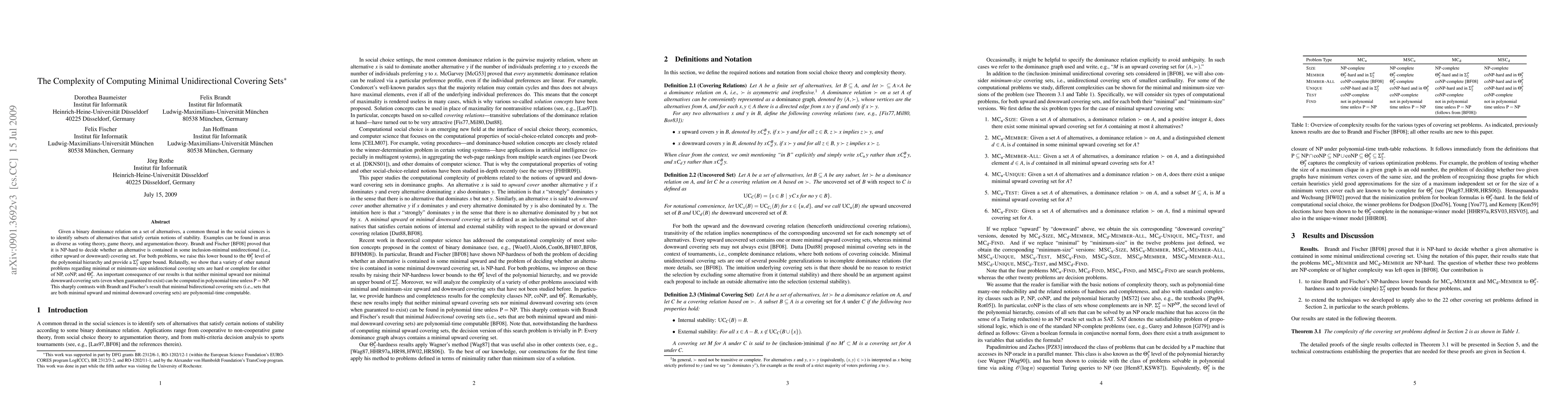 Given a binary dominance relation on a set of alternatives, a common thread in the social sciences is to identify subsets of alternatives that satisfy certain notions of stability. Examples can be found in areas as diverse as voting theory, game theory, and argumentation theory. Brandt and Fischer [BF08] proved that it is NP-hard to decide whether an alternative is contained in some inclusion-minimal upward or downward covering set. For both problems, we raise this lower bound to the Theta_{2}^{p} level of the polynomial hierarchy and provide a Sigma_{2}^{p} upper bound. Relatedly, we show that a variety of other natural problems regarding minimal or minimum-size covering sets are hard or complete for either of NP, coNP, and Theta_{2}^{p}. An important consequence of our results is that neither minimal upward nor minimal downward covering sets (even when guaranteed to exist) can be computed in polynomial time unless P=NP. This sharply contrasts with Brandt and Fischer's result that minimal bidirectional covering sets (i.e., sets that are both minimal upward and minimal downward covering sets) are polynomial-time computable.